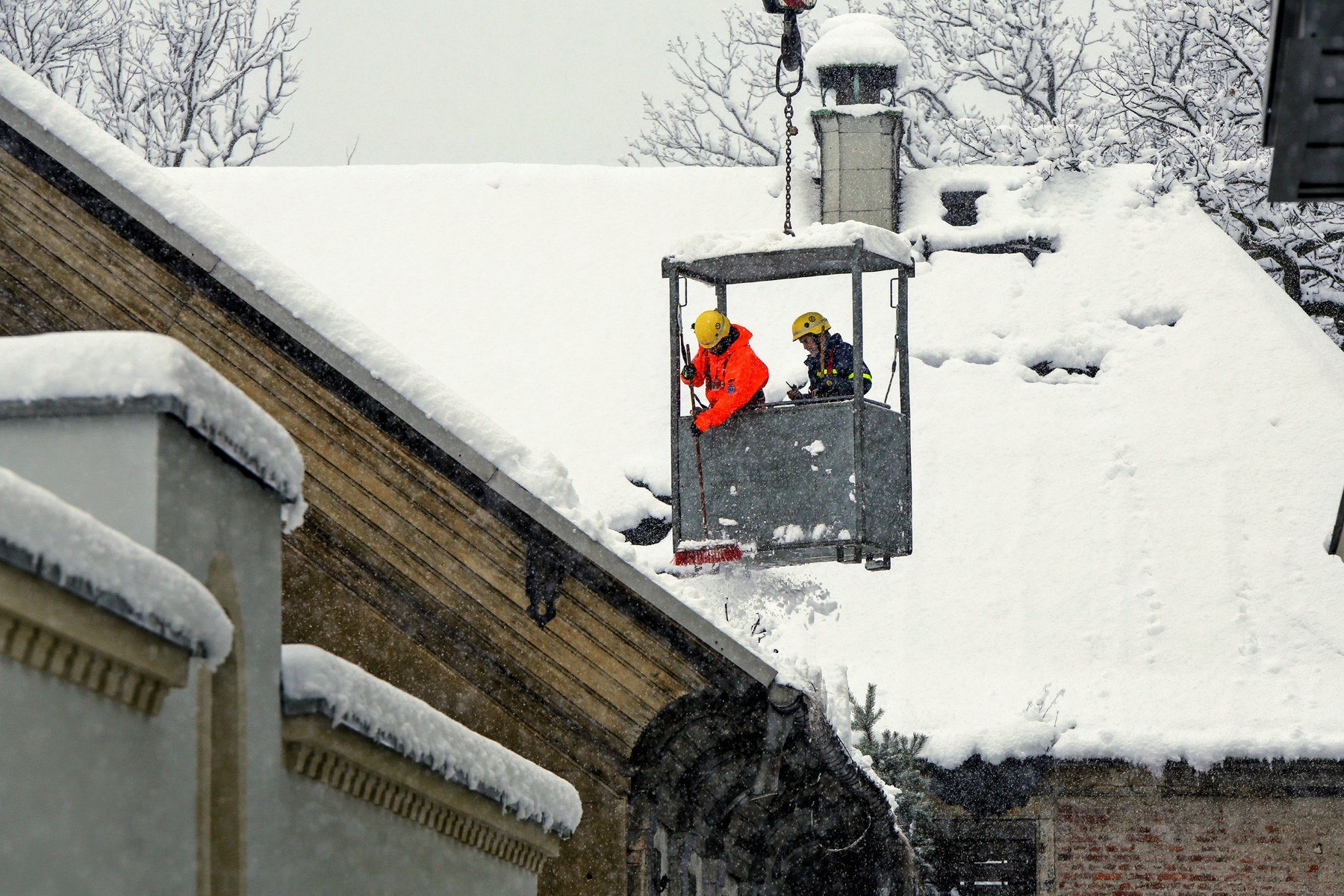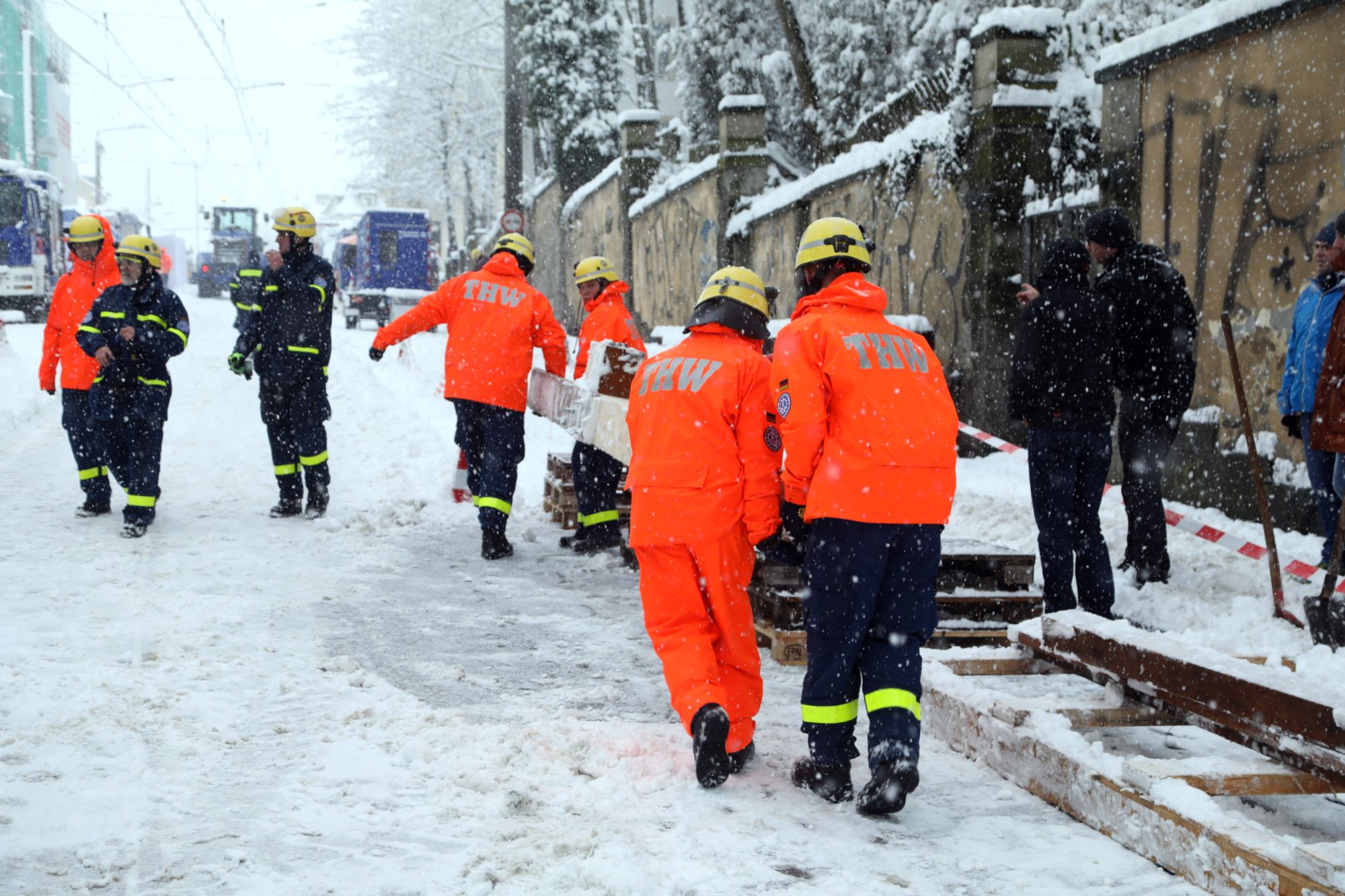 „Wenn die Wand einstürzt, fällt sie bis über die Mitte der Straße – da können wir kein Risiko eingehen“, erläutert Mancke. Mit einem Messgerät wird die bedrohte Mauer nun permanent vermessen. Als dann gestern Bewegung in das Haus kam, mussten erst einmal wieder alle vom Einsatzort abgezogen werden. Nun wurde die Mauer erst einmal provisorisch mit einem Bagger gesichert und das THW kämpft mit dem Schnee. Gleichzeitig haben die Männer das Gerüst fertig gestellt. Es soll nun so schnell wie möglich die Wand absichern.