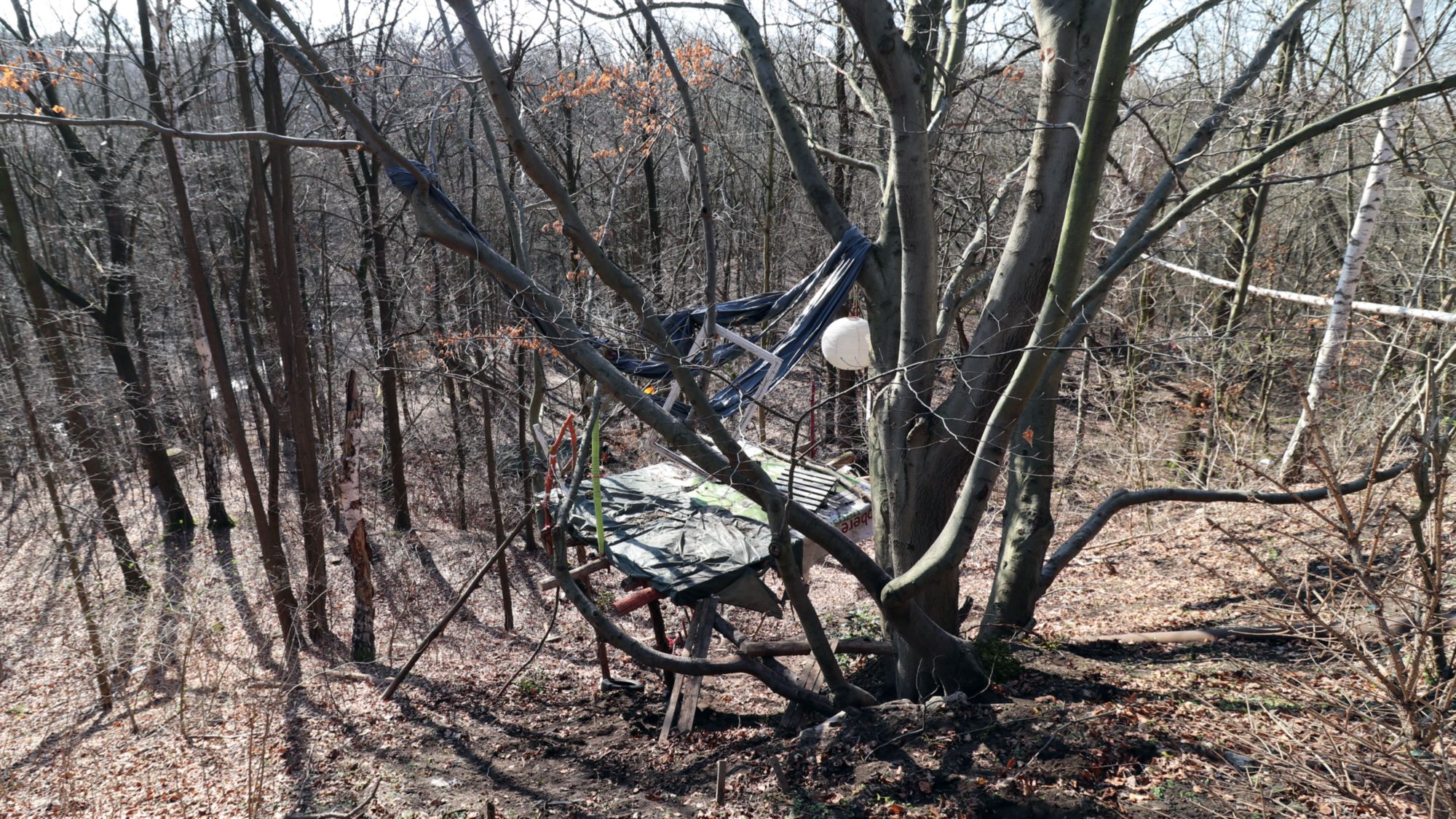 „Solange dafür herumliegendes Holz verwendet wird, ist dagegen auch nichts einzuwenden“, sagt Konstantin Schanze vom Sachsenforst. Doch in den vergangenen Wochen haben seine Kollegen in der Heide immer wieder Hütten entdeckt, die zum Teil mit Plastikplanen, Zelten und allerlei Campingutensilien gebaut sind.