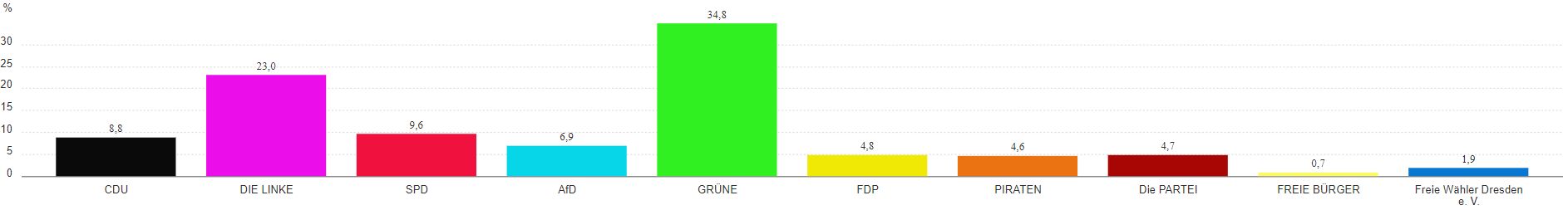 Die Grünen sind jetzt mit sieben Räten vertreten, ein Sitz mehr als bisher. Die Liste wird sehr deutlich angeführt von BRN-Organisatorin Ulla Wacker, die mehr als 8.000 Stimmen in der Neustadt einsammeln konnte, es folgen Johannes Lichdi, Christine Mantu, Oliver Mehl, Jutta Wieding, Klemens Schneider und Marco Joneleit. Wacker, Schneider, Mehl und Joneleit waren schon bisher im Stadtbezirksbeirat aktiv. Da Lichdi auch in den Stadtrat gewählt wurde, könnte mit Torsten Abel ebenfalls ein alter Bekannter in das Gremium einziehen.