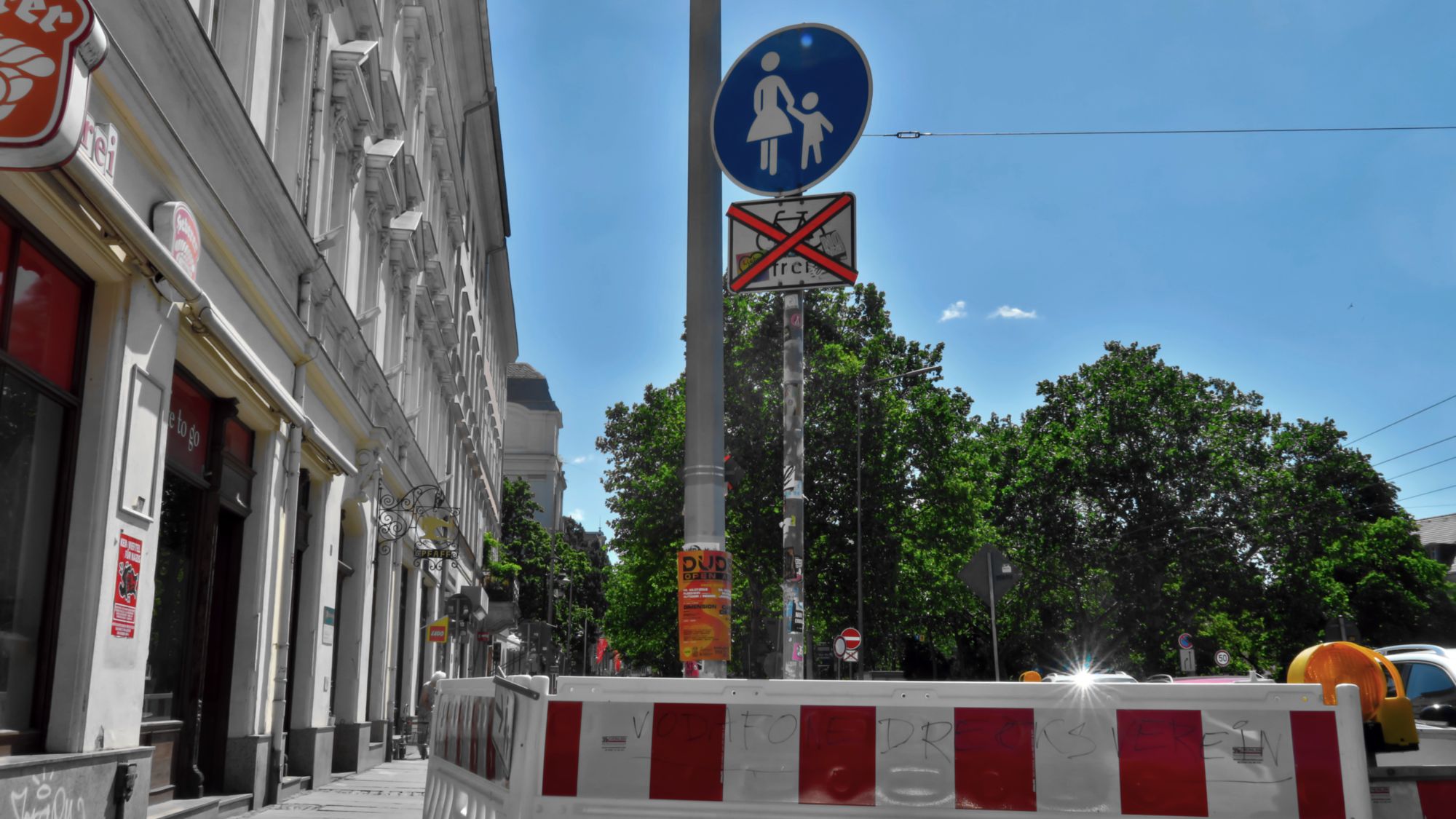 Derzeit gibt es bereits erhebliche Einschränkungen für den Fußgänger- und Radverkehr. Ab Sonnabend werden auch Autos und Straßenbahnen umgeleitet. Die Straße und die Leitungen darunter werden saniert.Wer auf die andere Seite der Bautzner will, muss Umwege in Kauf nehmen.Von der Alaunstraße zur Hoyerswerdaer zu gelangen, ist derzeit ziemlich mühsam. Ein schmaler Pfad führt an den Geschäften vorbei. Fußgänger*innen und Radfahrer*innen drängen sich auf dem Streifen. Die andere Straßenseite ist zwar eine Alternative, aber auch schwierig zu erreichen. Eine Überquerung von Alaun- zur Glacisstraße geht gerade gar nicht und auch der Umweg über die Ampel am Albertplatz ist kompliziert.