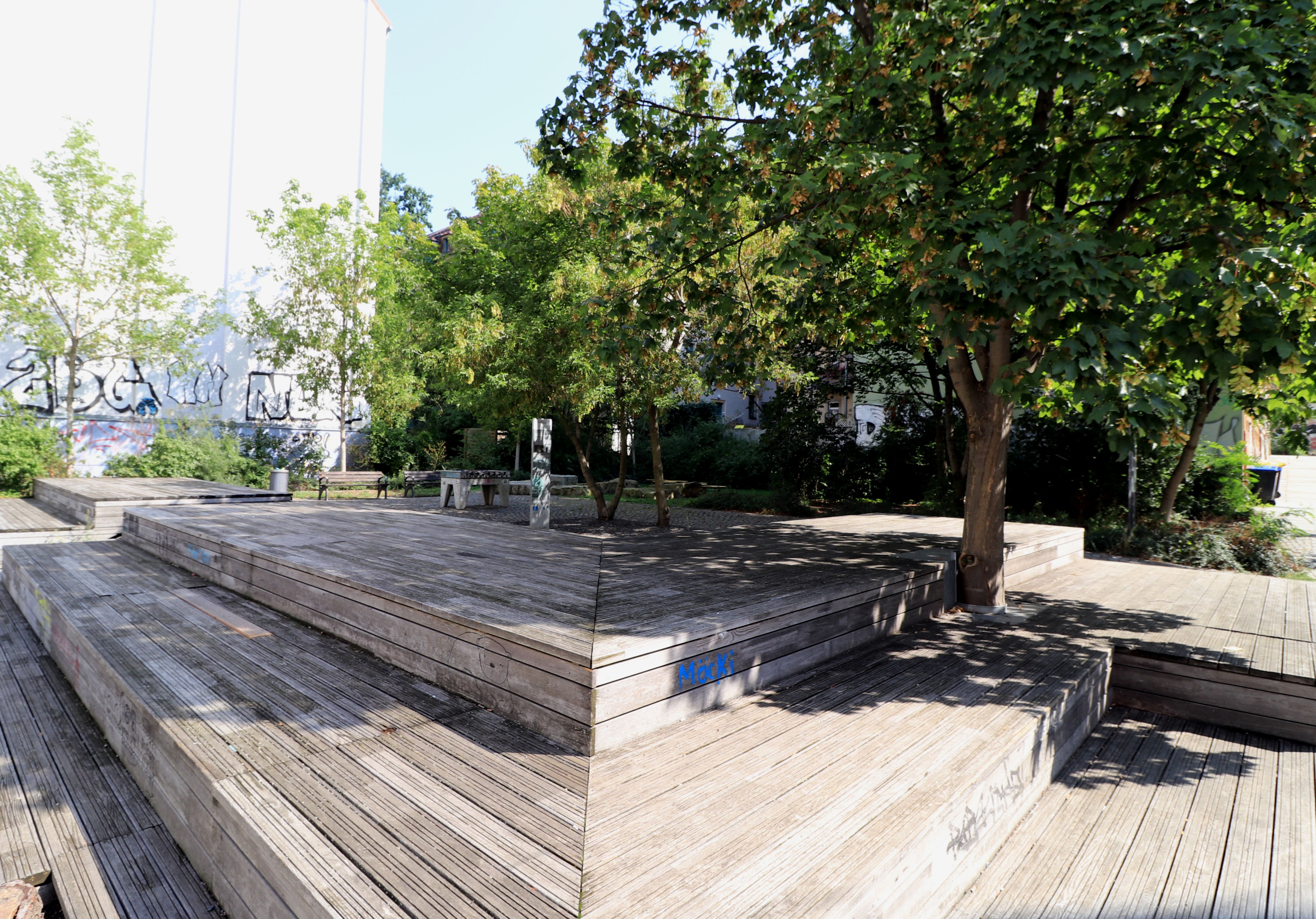 Seitdem gibt es vor Ort einen robusten Kicker-Tisch, ein Holzdeck, Murmelbahnen und kleinere Spielgeräte. Der Platz an sich ist in einem guten Zustand, nur scheint es offenbar einige zu stören, dass die Fläche als Spielplatz deklariert ist. Das Spielplatzschild wurde in den vergangenen Wochen mehrfach beschmiert.