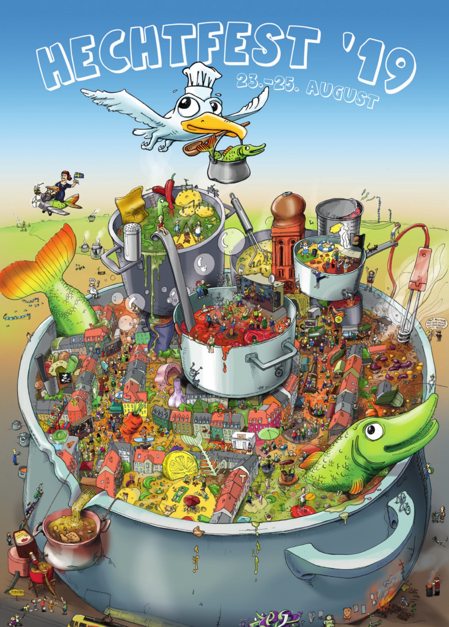 Der diesjährige Aufmacher verspricht eine bunte, deftige Suppe mit aller Hand Zutaten. Das beweist auch das Programm. Am ersten Tag des Hechtfests können sich vor allem Fans der Gitarrenmusik freuen. „The Gracefull Fall“, „Die Ukrainiens“, „Tune Circus“ und „Ute Moles“ sind nur ein Vorgeschmack für den rockigen Hechtfest-Auftakt. Es wird allerdings auch ein paar Beats geben, und zwar vom „DIY Soundsystem Culture“ an der „Wildsmile-Bühne“.