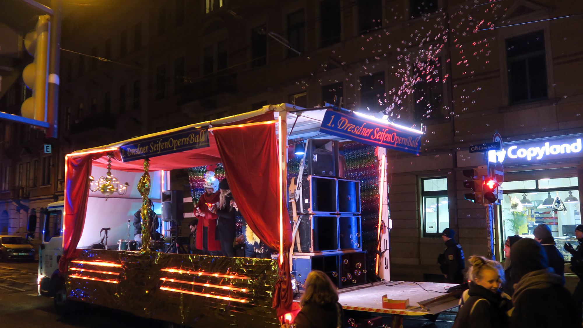 Kurz nach 18 Uhr startete der Umzug, begleitet von etlichen Kindern und ganz vielen Seifenblasen. Über die Görlitzer und Rothenburger ging es zum Albertplatz, dann über die Carolabrücke zum Schlossplatz. Dort spielte dann noch die Banda Kommunale auf.