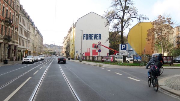 Aber was ist schon für die Ewigkeit. Nein bei dem Slogan „Paint forever“ – der dann zu sehen sein wird, wenn das Bild fertig ist, geht es um eine Liebeserklärung an Malerei und große Bilder, die sogenannten Murals. Gemalt haben mal wieder die Bandits und Slider. Die Kunst bleibt nun bis zum nächsten Werbekunden.