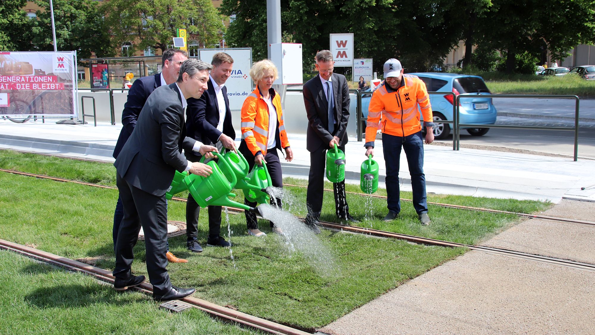 Baubürgermeister Kühn betonte, dass bei der Gestaltung auch auf Klimaresilienz geachtet wurde, nicht nur wegen des schicken Rasengleises, sondern auch durch den Einsatz helleren Asphalts im Kreuzungsbereich. So würde die sommerliche Erhitzung verringert. Amtsleiterin Prüfer hob hervor, dass auch die Ampeln an der Kreuzung zur Eisenbahnstraße umgebaut wurden, so kann man nun von dort aus kommend auch in Richtung Autobahn fahren. Außerdem wurden in dem Bereich die Geh- und Radwege erneuert.