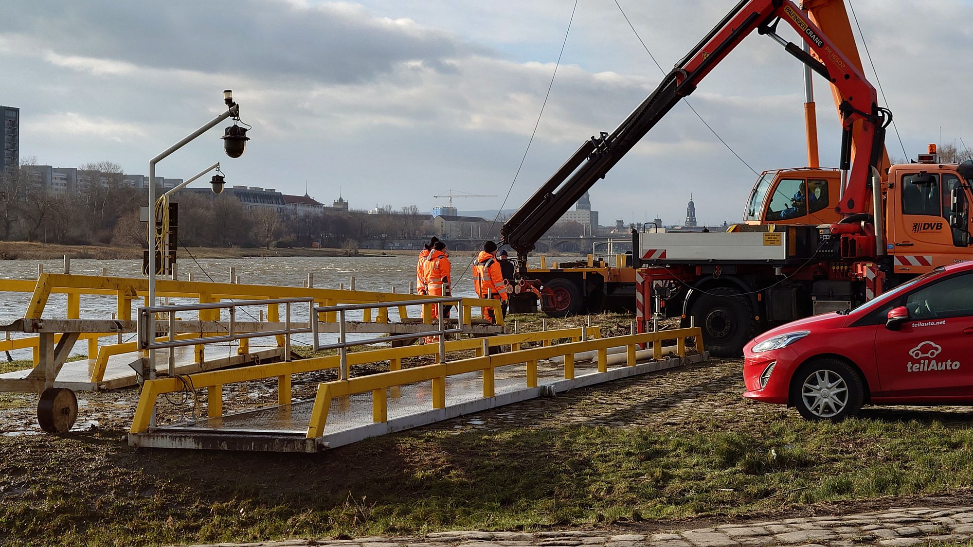 Wegen des Hochwassers über die Feiertage und am Jahresanfang mussten die DVB-Fähren zeitweise ihren Betrieb einstellen. Zwar können an allen Fährstellen die Anleger passend zum Wasserstand in ihrer Lage am Fluss verändert werden, aber bei sehr hohen oder auch ganz niedrigen Pegelständen endet diese Flexibilität. Während die Fährstellen in Laubegast und Kleinzschachwitz bereits am vergangenen Sonnabend und damit vergleichsweise schnell wieder ihren Betrieb aufnehmen konnten, mussten die Verantwortlichen am Anleger Johannstadt – Neustadt am Montag erst eine größere Säuberungsaktion starten, um dort das Treibgut vom letzten Hochwasser zu entfernen. Nachdem der Elektriker am Dienstag früh noch die Stegbeleuchtungen überprüft hat, ist seit 7 Uhr auch die Fährstelle in Johannstadt wieder planmäßig in Betrieb.