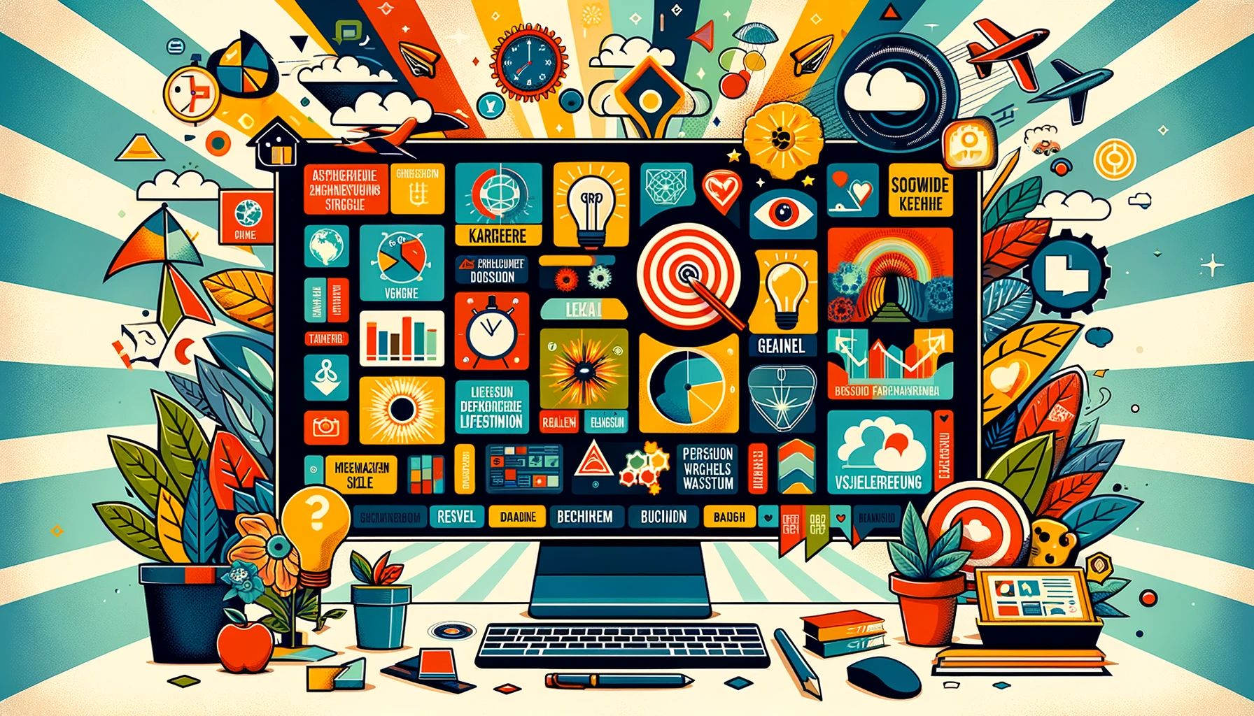 Ein Vision Board ermöglicht die visuelle Darstellung von Zielen und des Weges dahin. Es erzeugt damit ein klares und positives Bild im Kopf, das der kreativen Arbeit und der Motivation gleichermaßen dient.