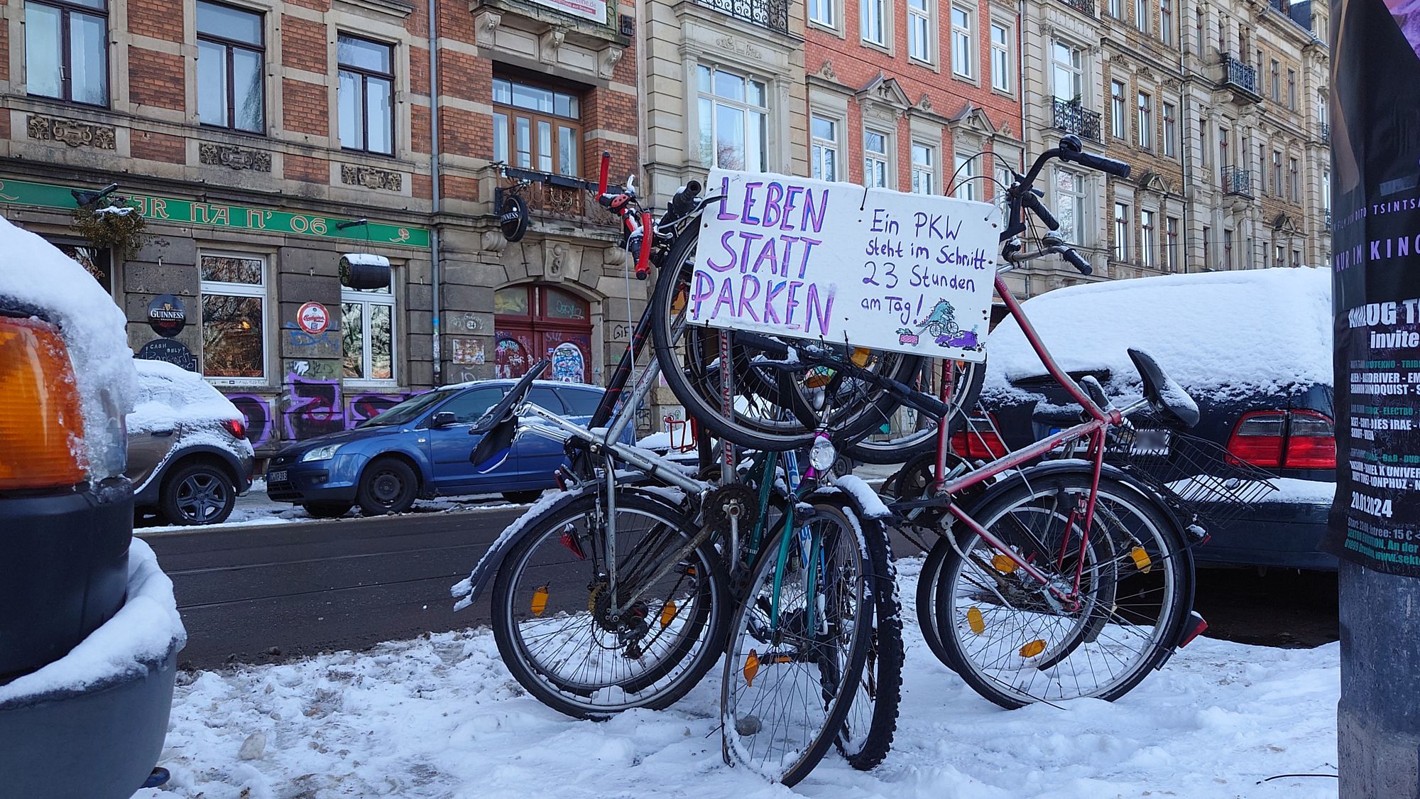 In der Nacht des 18. Januar 2024 haben Dresdner Aktivist*innen mithilfe von aneinandergeketteten Fahrrädern einen halben Parkplatz am Bischofsweg in der Äußeren Neustadt blockiert. Mit der Aktion wollen sie auf den übermäßigen Flächenverbrauch von Autos aufmerksam machen. Unter dem Motto „Leben statt Parken“ fordern sie die Umgestaltung des öffentlichen Raumes.