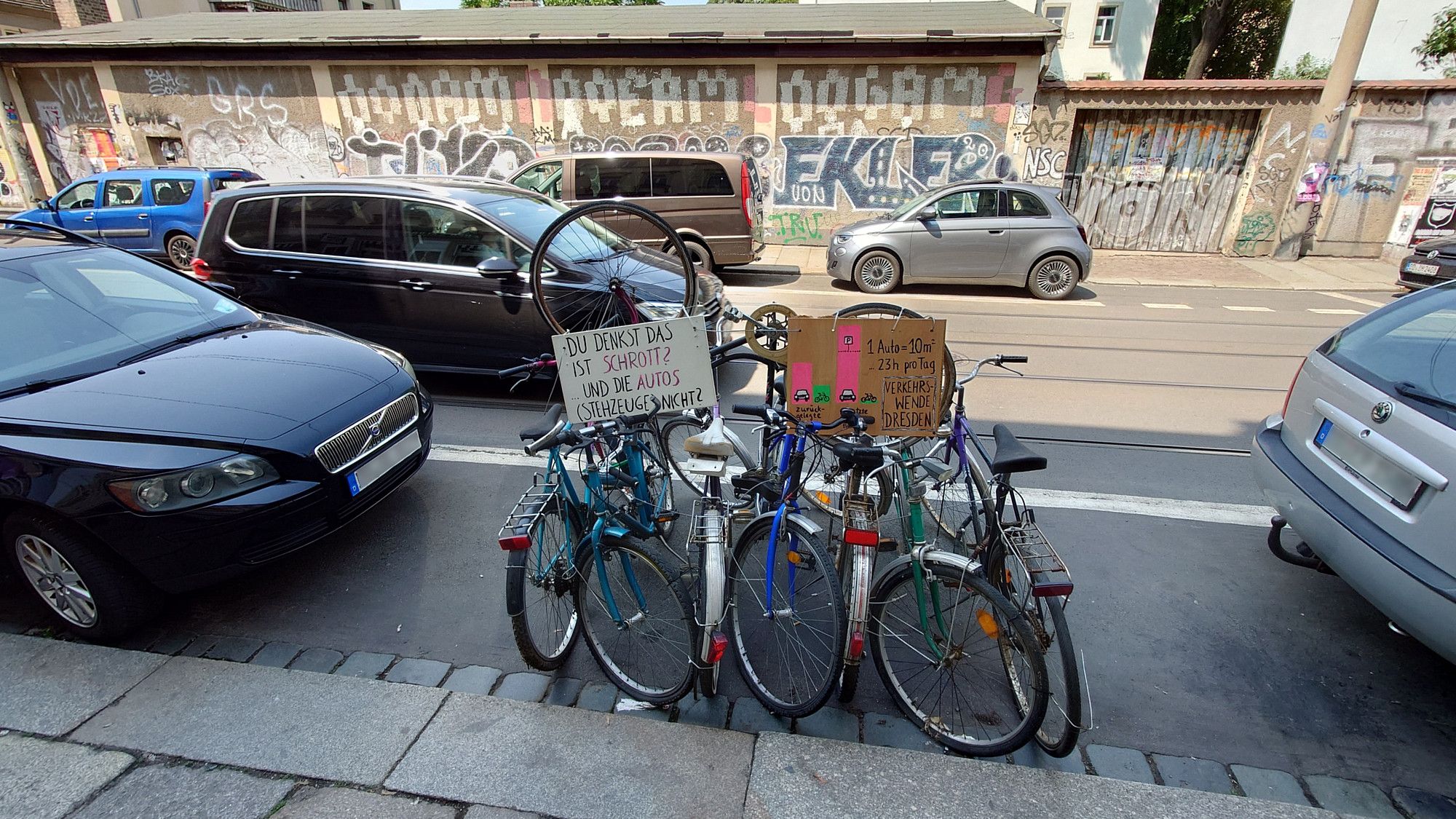 „Ein PKW steht im Schnitt 23 Stunden am Tag“, sagt Noah Wolu, Pressesprecher der Initiative „Verkehrswende Dresden“, und führt weiter aus: „Wir solidarisieren uns mit den Anwohnenden, die mit ihrer Aktion auf die verschwenderische