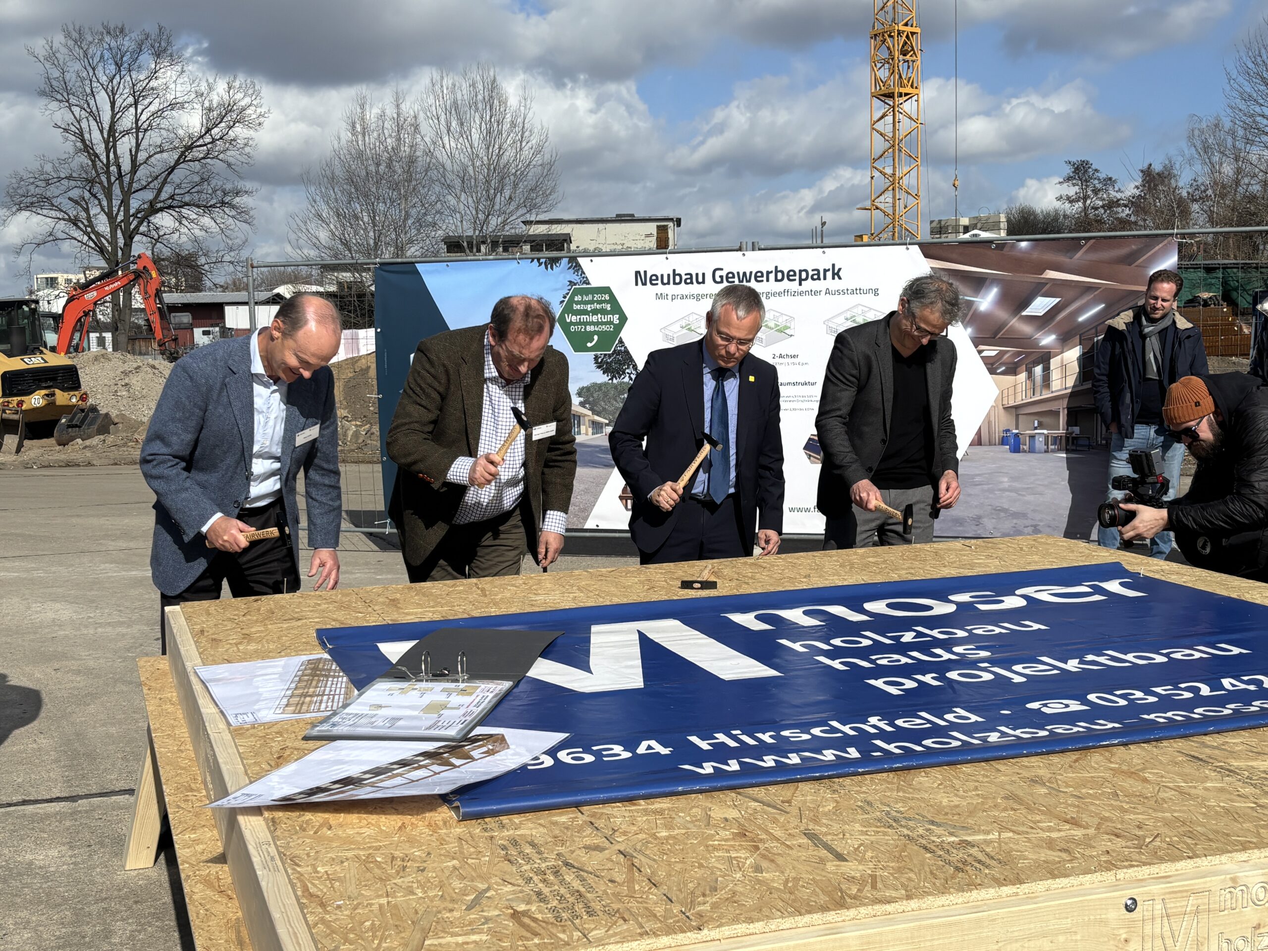 Mit einem sogenannten Hammerfest wurde nun offiziell der Start der Bauphase gefeiert. Auf dem Gelände entstehen fünf Hallen mit zusammen rund 4.900 Quadratmetern Mietfläche. Sie werden vollständig in modularer Holzbauweise errichtet. Viele Bauteile werden bei der Holzbau Moser KG in Reinsberg bei Nossen vorgefertigt und anschließend vor Ort montiert, was eine besonders kurze Bauzeit ermöglicht. Insgesamt sollen rund 550 Tonnen Holz verbaut werden.