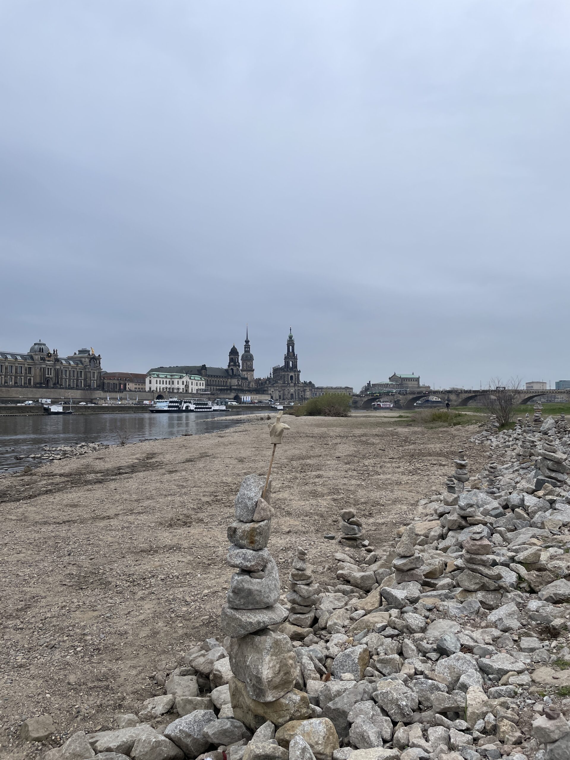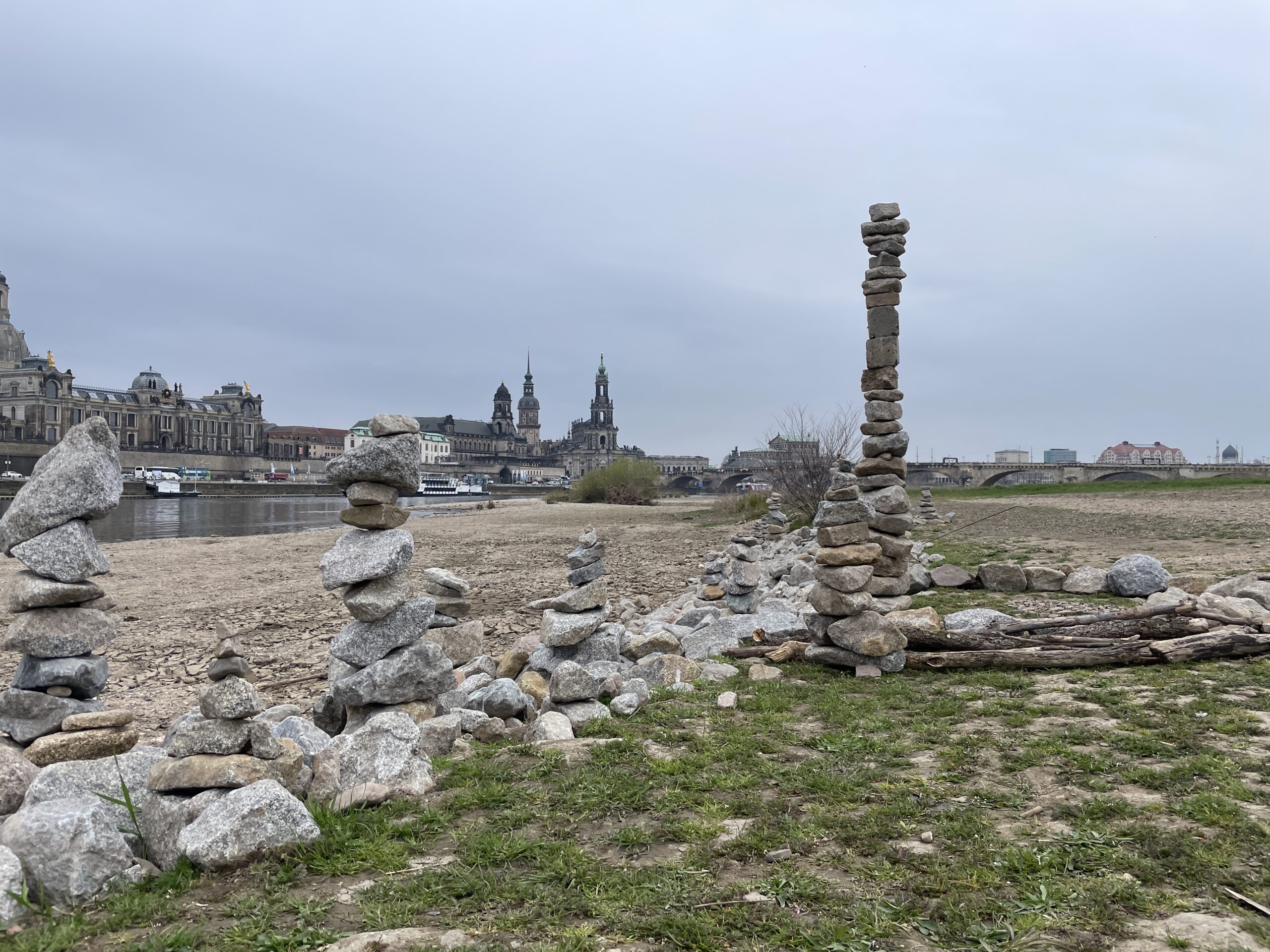 Wer in den letzten Tagen aufmerksam am Elbufer auf Höhe der ehemaligen Carolabrücke unterwegs war, dem sind sie vermutlich schon aufgefallen: zahlreiche Steinstapel, auch Steinmännchen genannt, aufgeschichtet aus Steinen und dem Geröll der mittlerweile längst verschwundenen Brücke. Die Türme ziehen sich in auffälliger Länge und in unterschiedlichen Größen über die durch den Abriss der Carolabrücke entstandene, bislang noch karge Uferlandschaft.