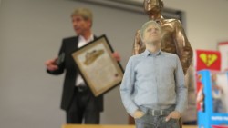 Mit Stolz präsentiert mir Thomas Pertermann die Spezialität des Hauses: Metalldruck. Kinderbücherumschläge, Verpackungen und Highlights in Kalendern glänzen im glamourösen Metallic-Look. Eine Investition, die WDS bis heute Spezialaufträge aus ganz Deutschland einbringt. Unten im heißen Klima der Druckwerkstatt rattert gerade wieder ein Kalender übers Laufband. Vom eigenen Metier begeistert führt Thomas Pertermann mich herum, demonstriert iPhone-kompatible Postkarten und solche, die weihnachtlich nach Zimt schnüffeln. Über dem Werktisch hängt ein Siebdruckposter der Black Keys, Marke Douze. Ein Geschenk von Lars P. Krause, der hier regelmäßig seine Werke zuschneiden kommt.