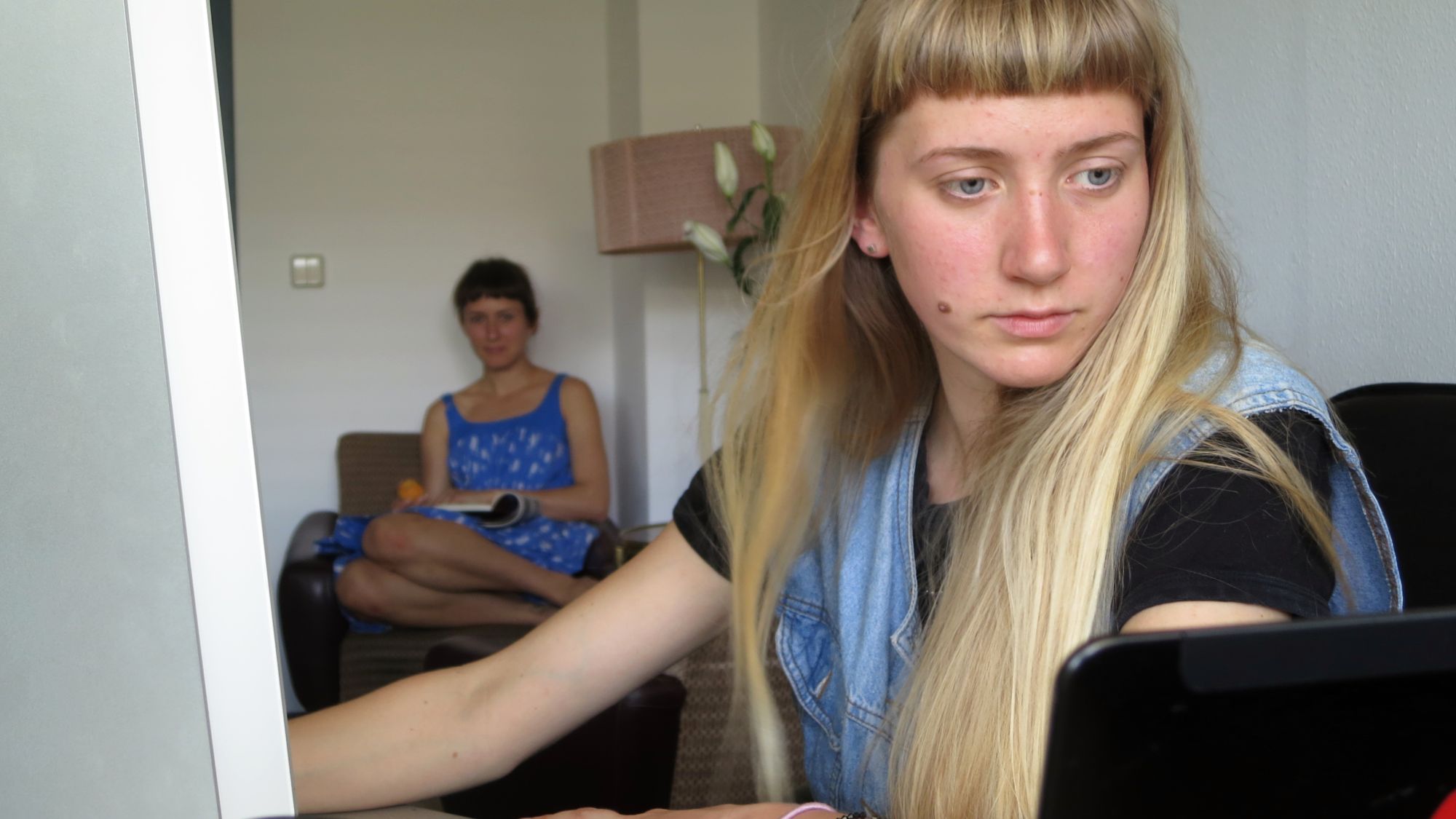 Kurator Sven Christian Schuch führt durch die Räume. Schon draußen sehen wir die Künstler von boijeot.renauld.turon im Planschbecken in der Sonne liegen. Zur Erinnerung, das waren die verrückten Franzosen, die im vergangenen Sommer mit Holzmöbeln durch die Neustadt gezogen waren. Dann führt er mich in ein Büro. Hier sind Jeannine Grosse & Philine Kuhn am Schaffen. Während die eine ganz angestrengt arbeitet, ruht die andere sich bequem aus. Die beiden Künstlerinnen umschreiben ihre Performance auch mit „Tippen und Toben“. Das sieht man sich am Besten live vor Ort an, erste Eindrücke gibt es auf der Facebook-Site des Künstler-Duos.