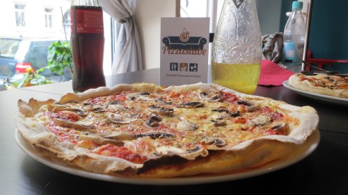 Ein junger Mann grinst mich an, es ist Rico, der Chef und Pizzabäcker. Ich bestelle eine Pizza Funghi, die kostet hier, wie alle Pizzen, 5,- Euro. Dann warte ich gespannt. Es ist schon die zweite Pizza in dieser Woche und am Vortag war ich im „Sapori d`Italia„. Der Vergleich wird eine Herausforderung für das neue Stübchen auf der Hechtstraße. Nach kurzer Zeit, es war aber zugegebener Maßen auch recht wenig los, stellt Rico die Pizza hin und ich kann anfangen zu knuspern. Der Teig ist schön durchgebacken, wunderbar dünn, ausreichend belegt, man möchte meinen, Rico ist bei einem Italiener in die Lehre gegangen. Die hier braucht den Vergleich zur Pizza auf der Louisenstraße nicht zu scheuen.