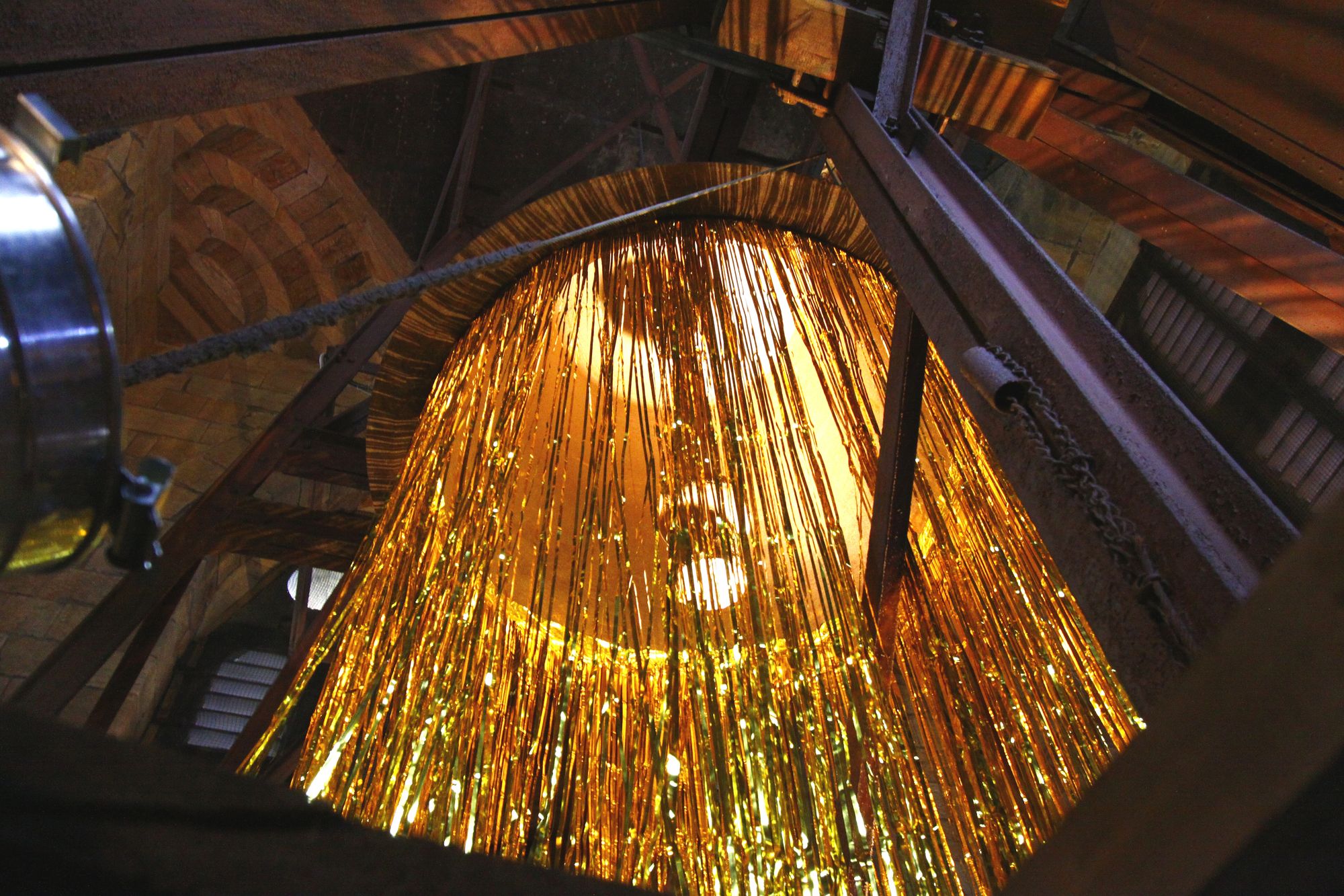 Marí Emily Bohley bei der Installation ihrer Ausstellung. Foto: Youssef SafwanDas Ornö-Festival rückt immer näher. In dieser Woche wurde damit begonnen, den Glockenturm der Simultankirche St. Martin zu schmücken. Die Kirche an der Stauffenbergallee ist besser bekannt als Garnisonkirche. Deren rund 90 Meter hoher Glockenturm wird nun Herberge einer ganz besonderen Ausstellung. Die Neustädter Künstlerin und Preisträgerin des Propreum-Kunstpreises, Marí Emily Bohley, schmückt Glocken und und das Innere des Turmes mit Unterstützung eines Fassadenkletterers. Goldene Glocke Foto: Youssef SafwanNun hat Frau Bohley die Glocken mit goldenem Lametta geschmückt, die werden beleuchtet und da in der Höhe von etwa 50 Metern meist ein guter Luftzug ist, wehen die Fäden und glitzern dabei beeindruckend. Dementsprechend lautet auch der Titel ihrer Ausstellung: „Der Geist weht wo er will“ – dieses Zitat aus der Vulgata, der Bibelübersetzung des Hieronymus, wird heute gern verwendet, wenn es darum geht, die Freiheit der Gedanken zu beschreiben.