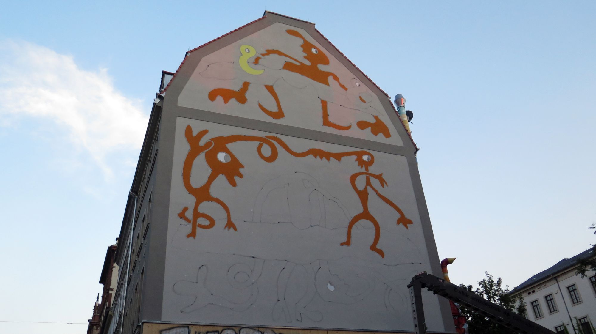 Früher war der Schriftzug im ganzen Bild versteckt: RichaâârdRichaâârd hatte die Skizze vorgegeben und die Maler Anja Tomaschewski und Andy Domigall füllten die Fläche mit Farbe. Jetzt leuchtet das Haus prächtig in der Sonne. Zum Bild sagt der Künstler: „Die Straßen der Dresdner Neustadt sind in wirklichem Sinn Lebensraum, man könnte sie mit einem Wohnzimmer vergleichen.“ Und über dem Sofa im Wohnzimmer wolle er gern ein etwas fröhliches sehen, etwas „zum Kichern“. Den unteren Bereich, den einst die Schriftzüge „ASiA“ und „jEFF“ zierte, hat er wieder frei gelassen. Dort wollen in naher Zukunft Dresdner Graffiti-Künstler den alten Schriftzug in neuer Form aufleben lassen. „Sie haben mich sogar nach den Nummern meiner Farben gefragt“, berichtet Richaâârd.