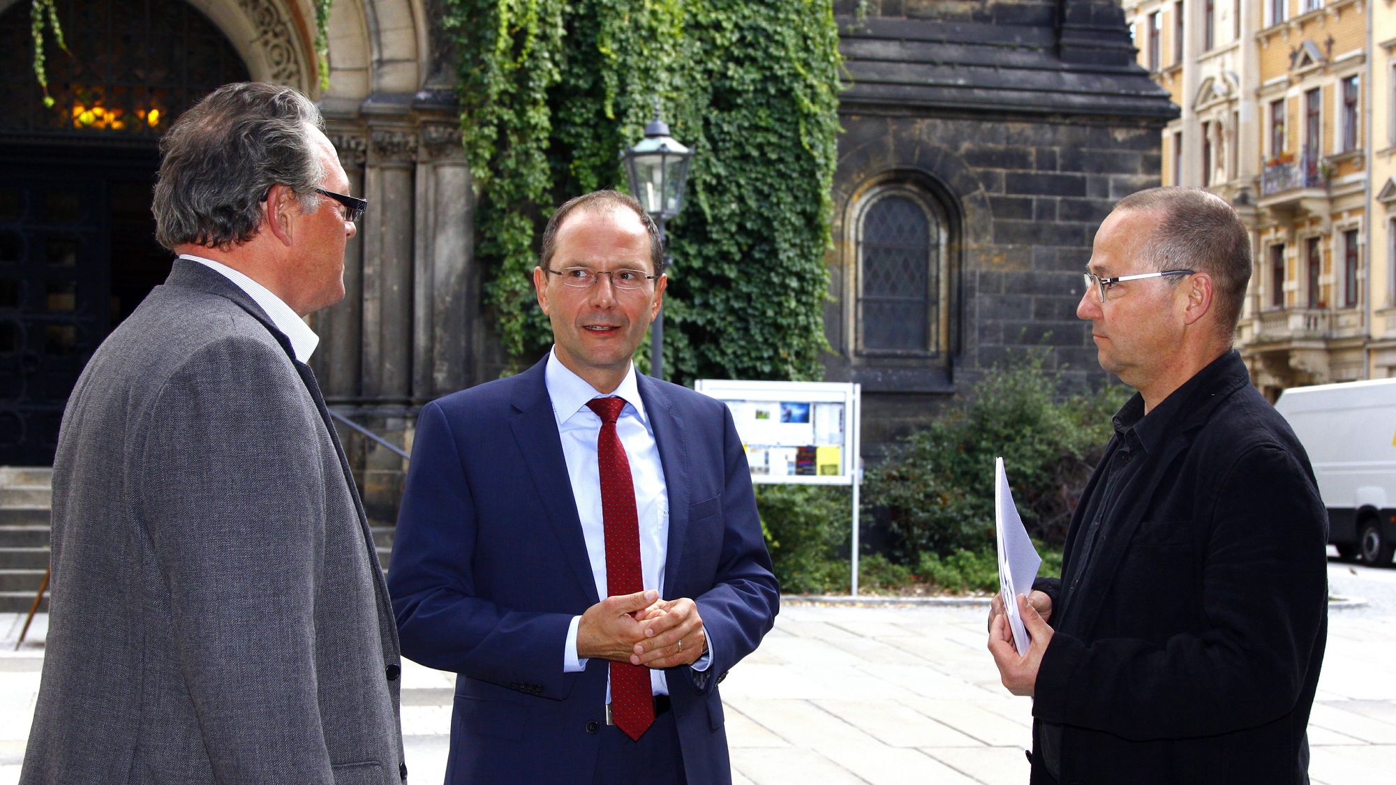 Kirchenmänner Eckehard Möller und Christoph Hahn haben gut lachen: Minister Markus Ulbig bringt Bescheid über 400.000 Euro Förderung Foto: Y. Safwan