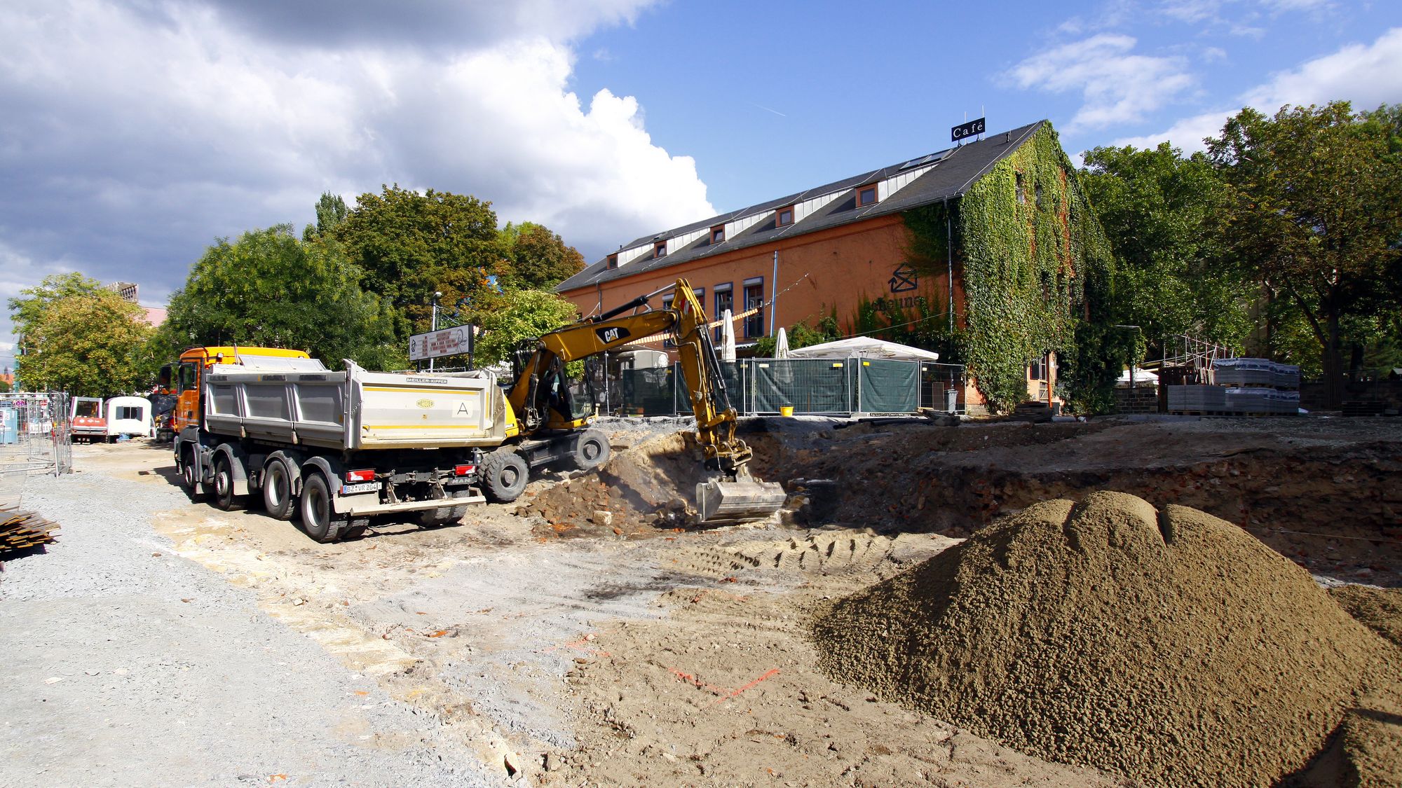 Der Star des Nachmittags war eine große Visualisierung, die endlich aktuell zeigt, wie der Platz mal aussehen soll. An den Details, was geplant ist und was wann fertig wird, hat sich nichts geändert (Vergleiche Neustadt-Geflüster vom 27. August). Die Projektleiterin von der Stesad, Undine Neubert, erklärte am Rande der Vorstellungsrunde, dass die Arbeiten gut in der Zeit liegen. Aktuell wird der Untergrund ausgebaggert und verfestigt, damit der auch künftigen Festivitäten standhalten kann.