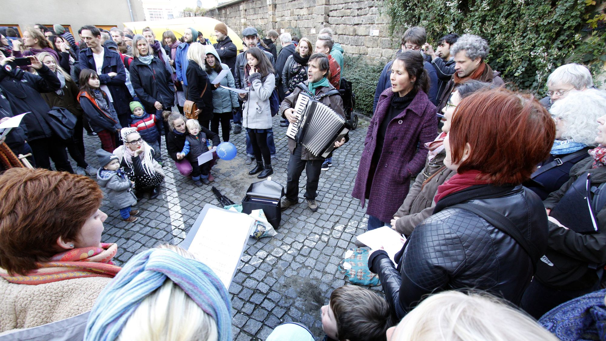 Der Hof war gut gefüllt. Die Besucher standen zum Teil bis auf die Straße hinaus. Foto: Youssef SafwanMit einem großen Wilkommensfest wurden gestern die neuen Bewohner der Katharinenstraße begrüßt. Mehrere hundert Neustädter feierten mit Kaffee, Kuchen, Nudeln und jeder Menge Musik. Das Hinterhaus ist fast fertig eingerichtet und soll nächste Woche bezogen werden.