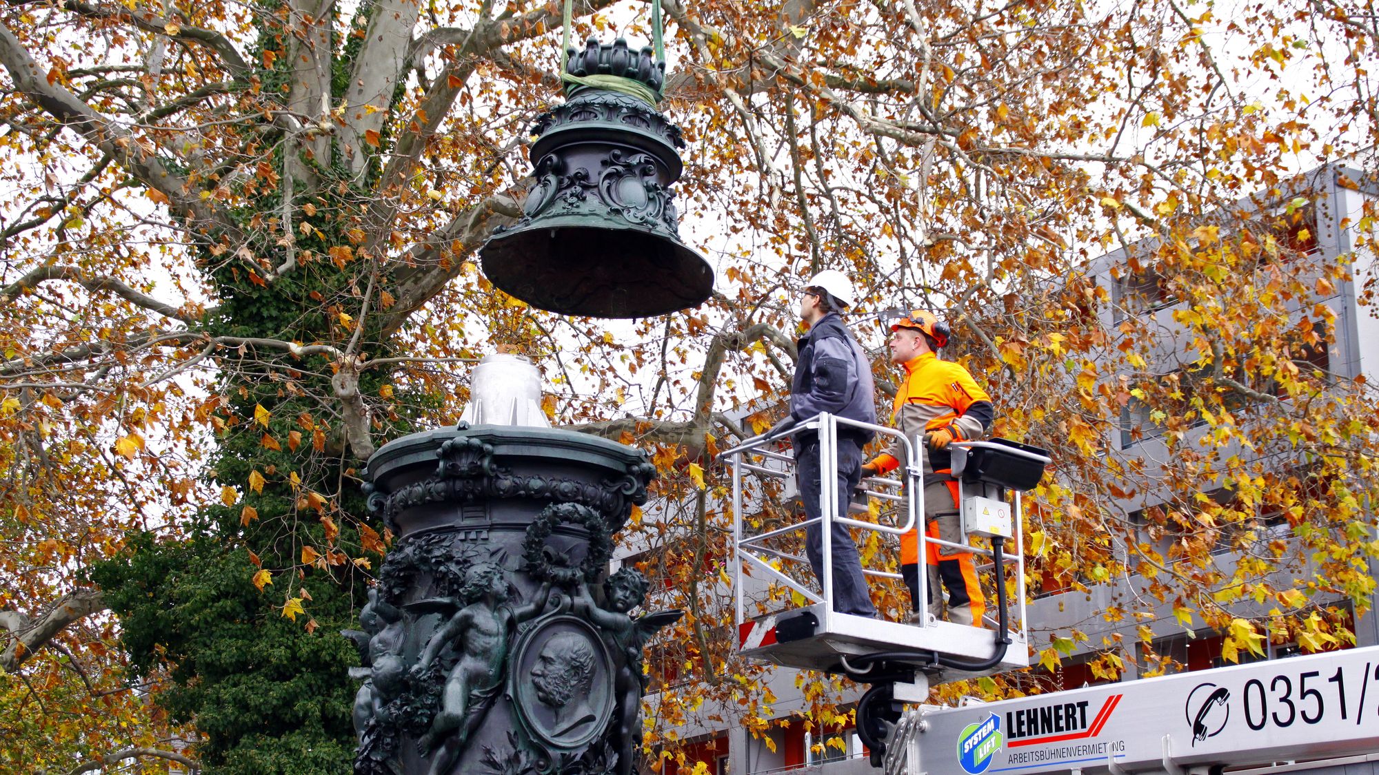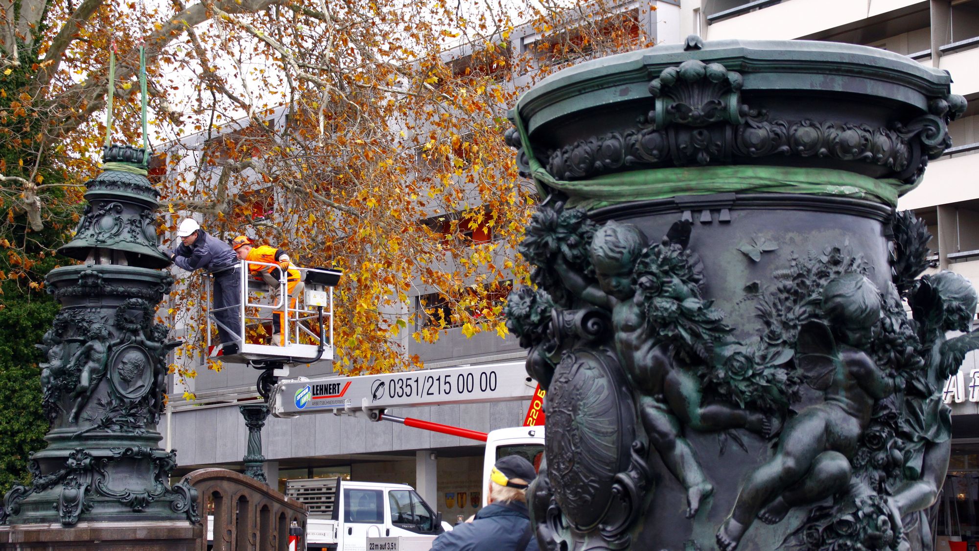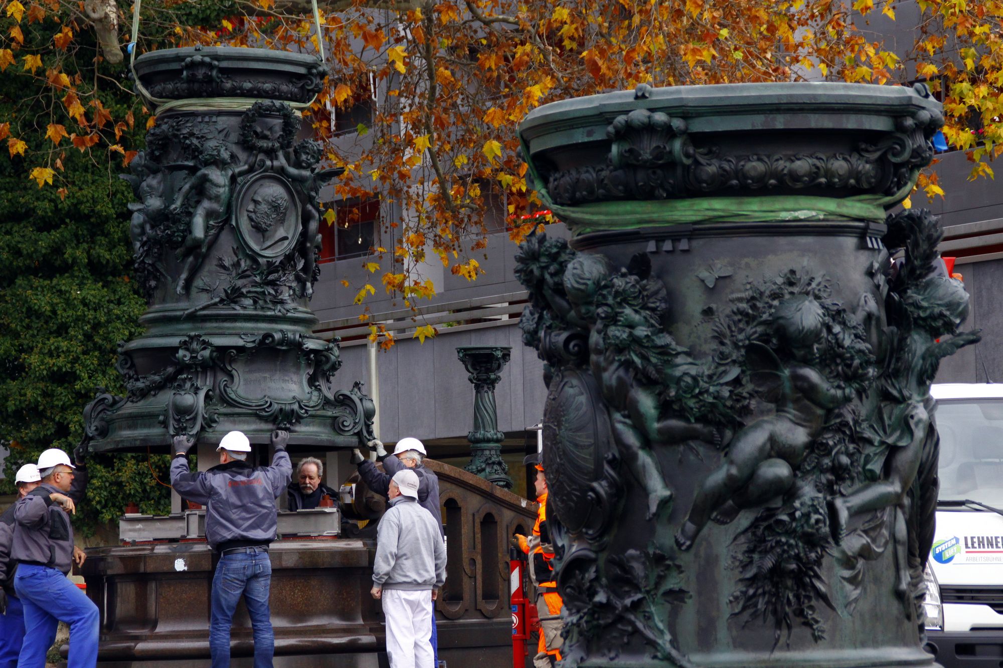 Ab 10 Uhr wurden die historischen Fahnenmasten am Goldenen Reiter wieder aufgestellt. Die bronzenen Postamente und die Stahlhalterung im Inneren wurden zuerst montiert. Anschließend wurden die etwa 20 Meter langen Fahnenstangen eingesteckt.