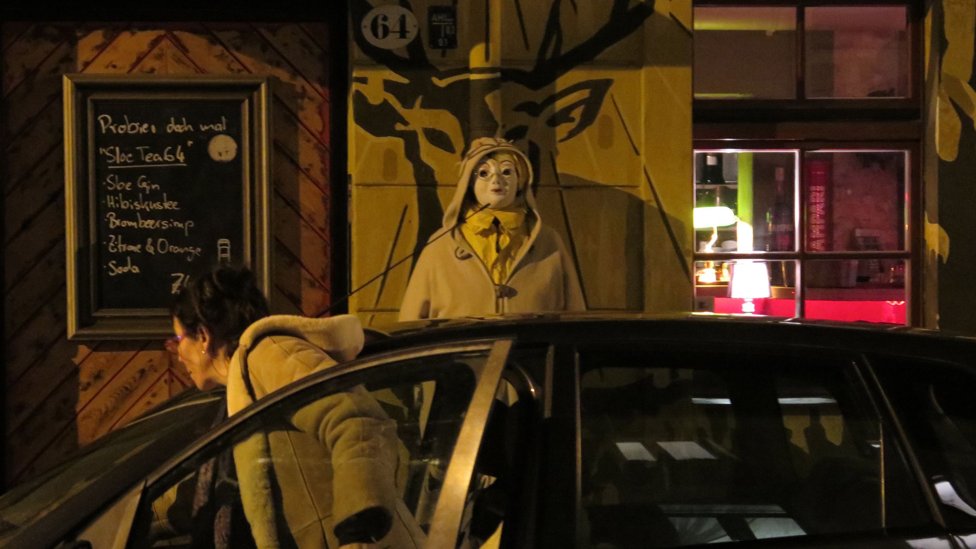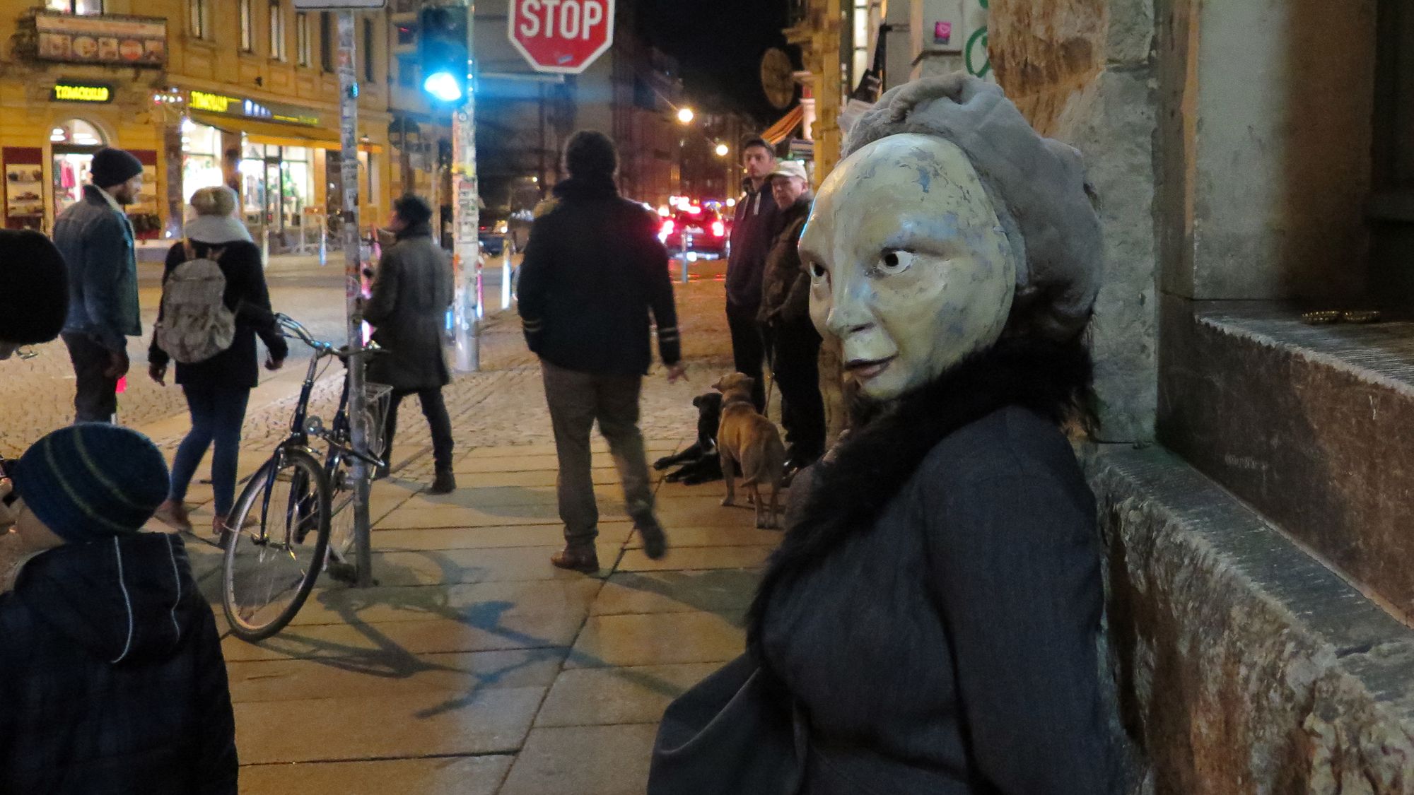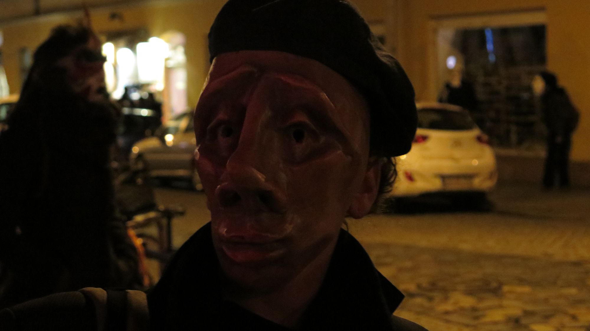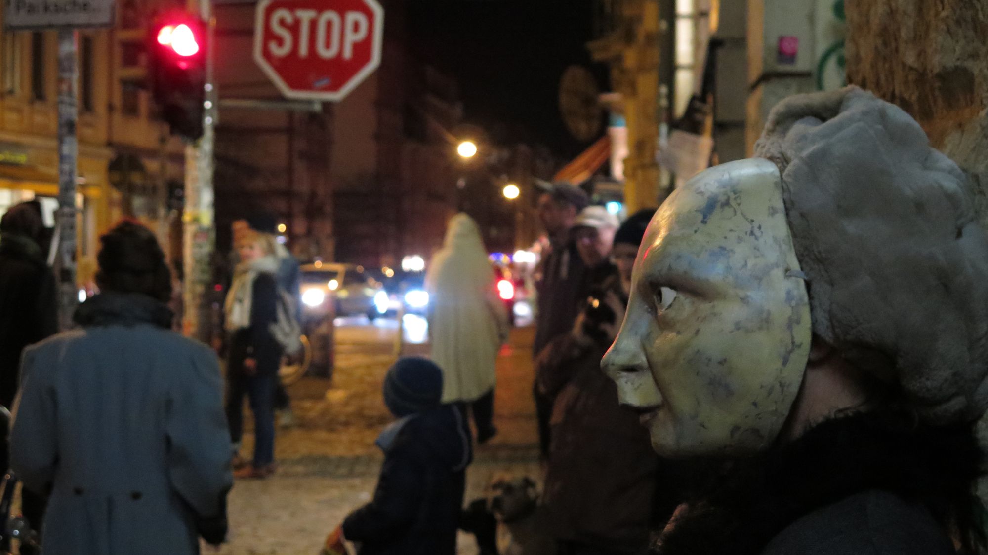 Ich reiße mich los, springe über die Kette, stehe auf der Straße, herannahende Autos scheinen mir ungefährlich im Vergleich zu diesen Fratzen. Dann flammt ein Licht auf, eine Kamera blitzt in die Nacht, jemand lacht. Ich trete ein paar Schritte zurück und verfolge die Szenerie von der anderen Straßenseite. Etwa zehn bis zwanzig Personen haben sich teils in Kostüme gehüllt, alle tragen sie Masken. Manche schrill und bunt, einige hautfarben und erschreckend lebensnah und doch so unglaublich starr.