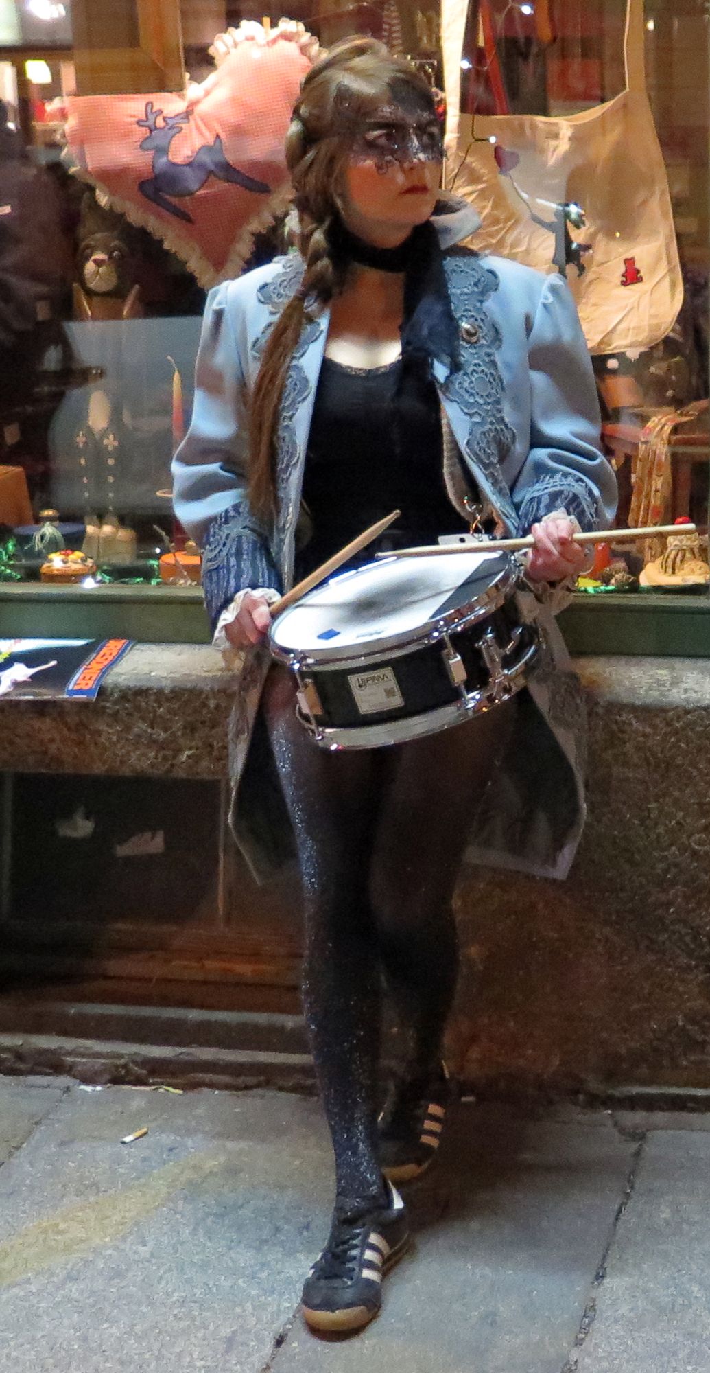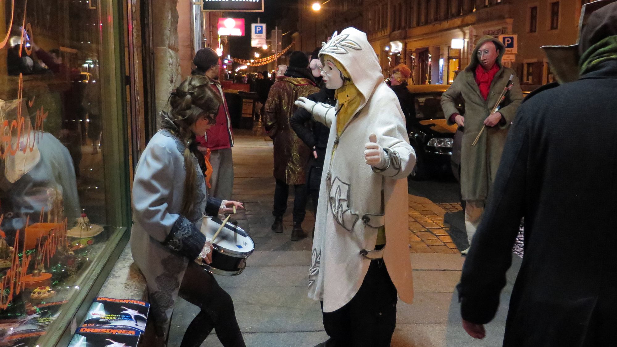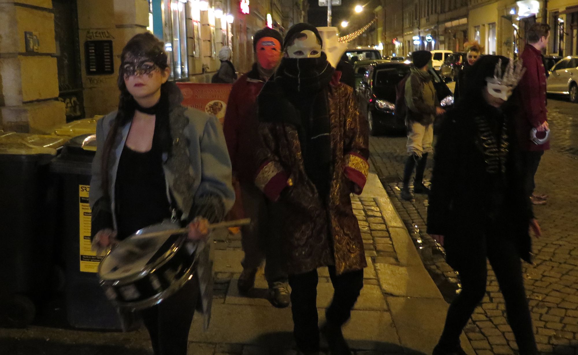 Die maskierte Truppe hatte sich aus dem Nichts auf der Louisenstraße, Ecke Pulsnitzer versammelt und schlenderte dann gemütlich die Louisenstraße entlang. Von der sozialen Ecke ging es dann weiter gen Alaunstraße und dann zum Albertplatz. Die Ordnungsbehörden schickten spontan ein paar blau-weiße Autos vorbei. Als die aber erkannten, dass es sich diesmal nicht um einen Antifa-Umzug handelte, zogen sie schnell weiter.