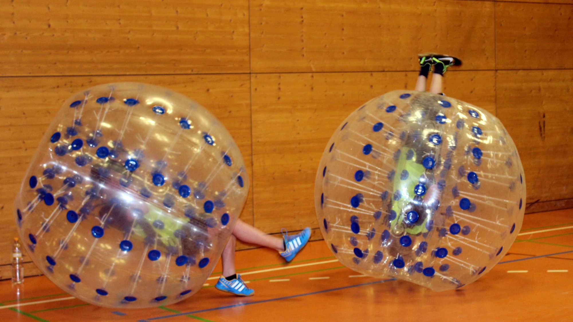 Anja und Steve, im wirklichen Leben eher mit einem staubtrockenen Büro-Job beschäftigt, haben Bubbleball-Fussball aus England importiert. „Dort ist das schon der große Renner“, erzählt Anja. Der neue Trendsport wird auf einem kleinen Fussballfeld gespielt, im Sommer draußen, im Winter in der Halle. Beim Bubbleball sind Zusammenstöße mit den Spielern ausdrücklich erwünscht. Dabei sind die Spieler durch einen großen kugelrunden Gummi-Überzug geschützt. In dem stecken sie wie in einem riesigen Airbag.