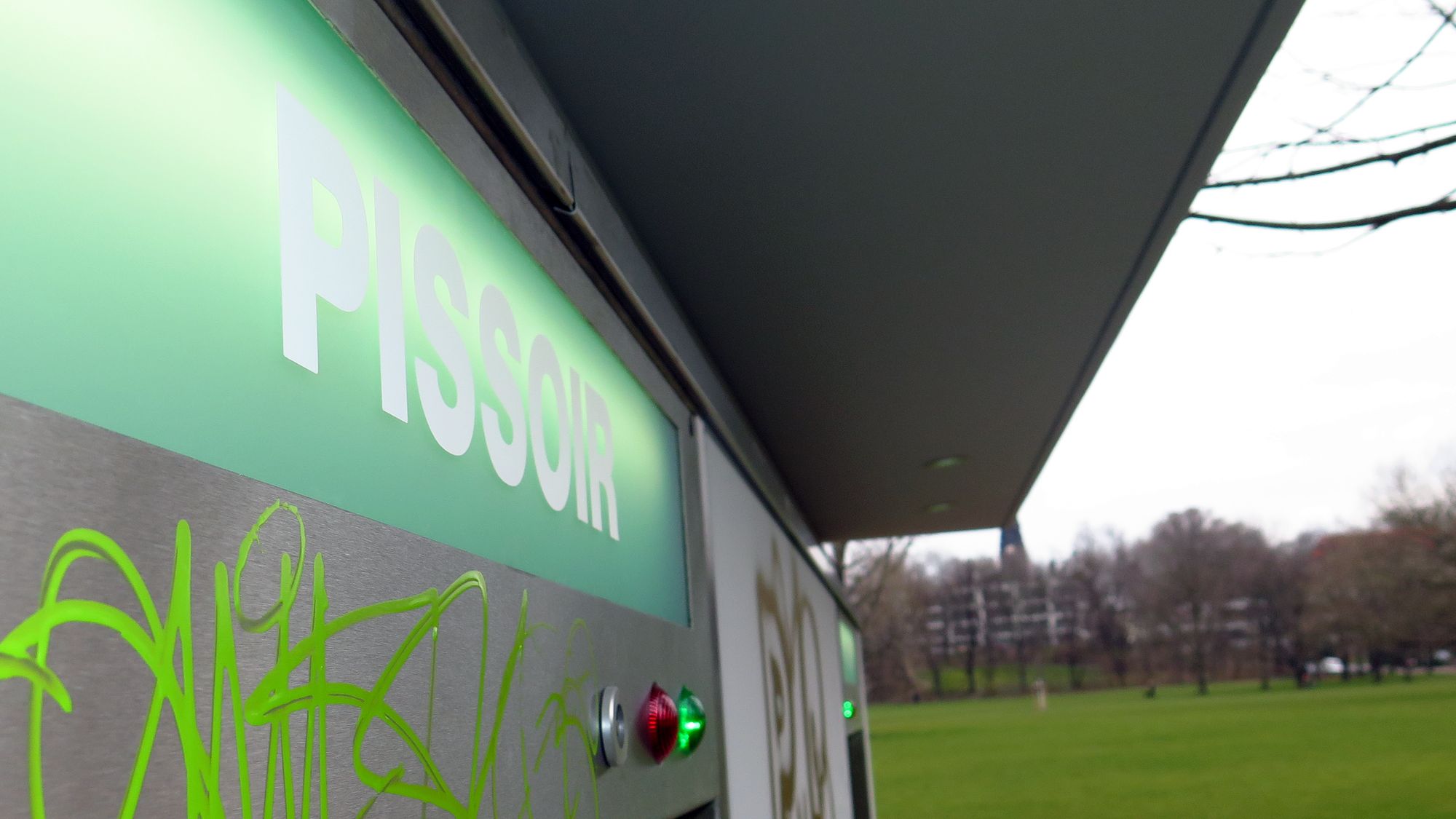 Es gibt einen Raum für eine Behinderten-Toilette, ein Pissoir mit drei Becken, ein Damenklo plus Wickelraum und ein Herrenklo fürs große Geschäft. Zurzeit sind die Räume innen noch unglaublich unbeschmiert. Und auch in der Außengestaltung hat sich was getan. Das gereckte Glied wurde in einen kleinen grünen Katus verwandelt. Ortsamtleiter André Barth kämpft weiterhin darum, dass an dem Häuschen eine legale Graffiti-Fläche entsteht, aber die Chancen darauf sind gering.
