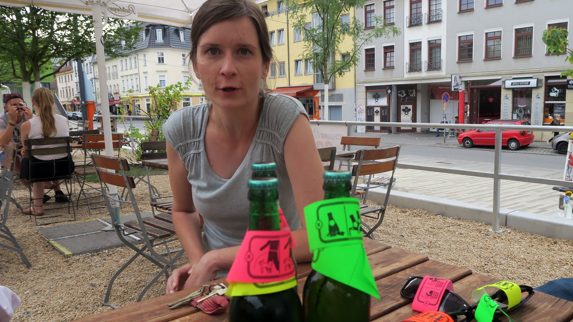 „Wir sind nicht die Ordnungshüter“, betont Romy Jaehnig, die Geschäftsführerin des Scheune e.V., mit der Aktion wollen wir sensibilisieren. Deshalb haben die Bierflaschen kleine Umhänger bekommen, auf Piktogrammen wird für mehr Friedlichkeit, ganze Gläser, etwas Ruhe und den Gang zur Toilette geworben. Der ist gar nicht so weit. Mit einem großen Plakat werden nun die Wege zum Pissoir an der „Bunten Ecke“ (Alaun-/Böhmische Straße) oder zur öffentlichen Toilette auf der Louisenstraße unter dem großen Wandbild aufgezeigt, den Weg zu letzterem deuten auch die gelben Fußspuren an.