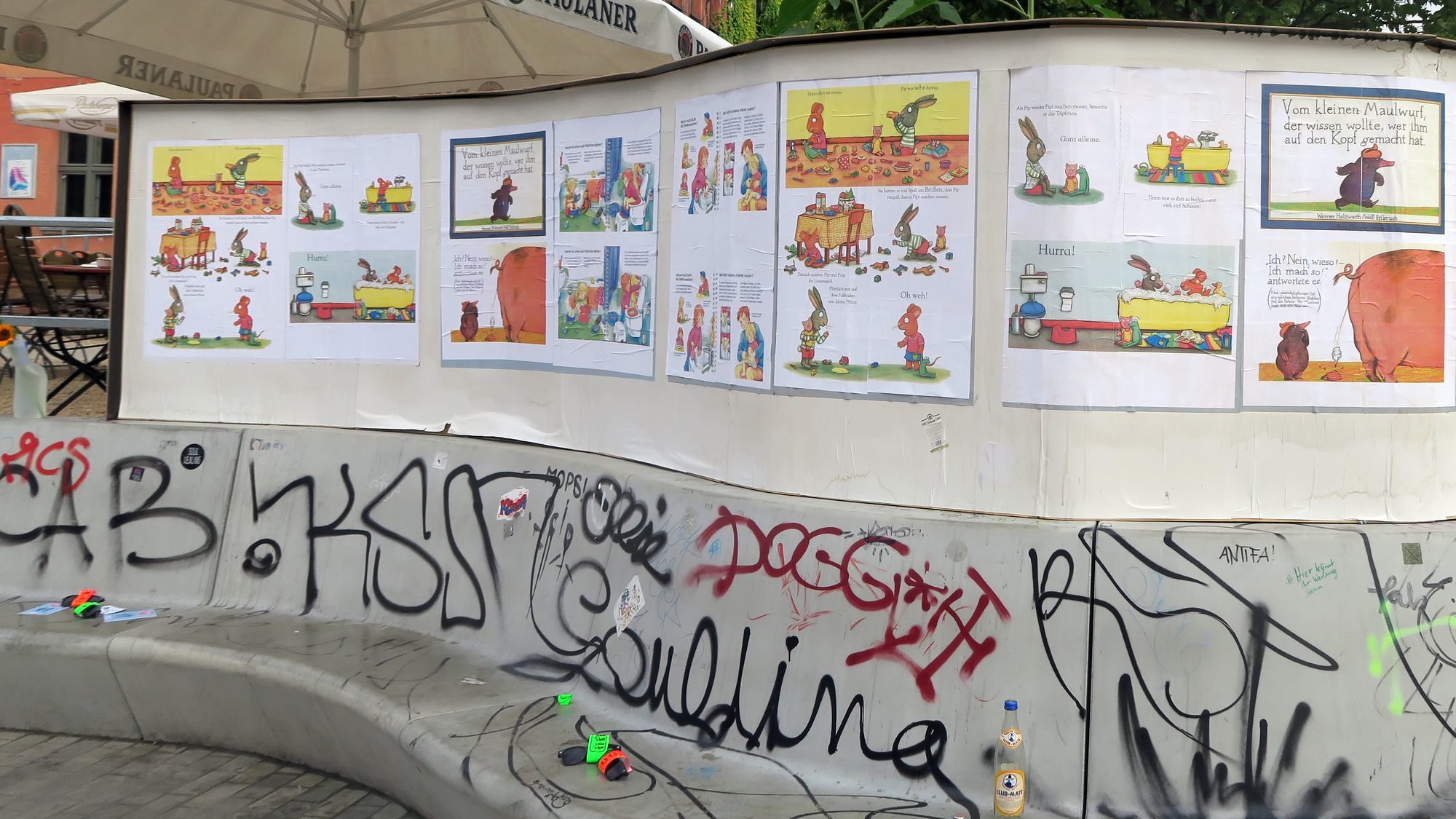 Der kleine Maulwurf informiert über Hygiene.Außerdem ziert die Brüstung über der großen Bank nun ein paar Comics, die sich mit dem Thema Hygiene beschäftigen. Ahmet Özer, Chef vom gegenüberliegenden Ararat will sich an der Aktion beteiligen und den verkauften Bieren auch die Piktogramm-Anhänger überstülpen. Und, so verriet der zufällig anwesende Ortsamtsleiter André Barth, das Ararat wird sich an der „Netten Toilette“ beteiligen. Also noch ein Grund weniger für Wildpinkelei.