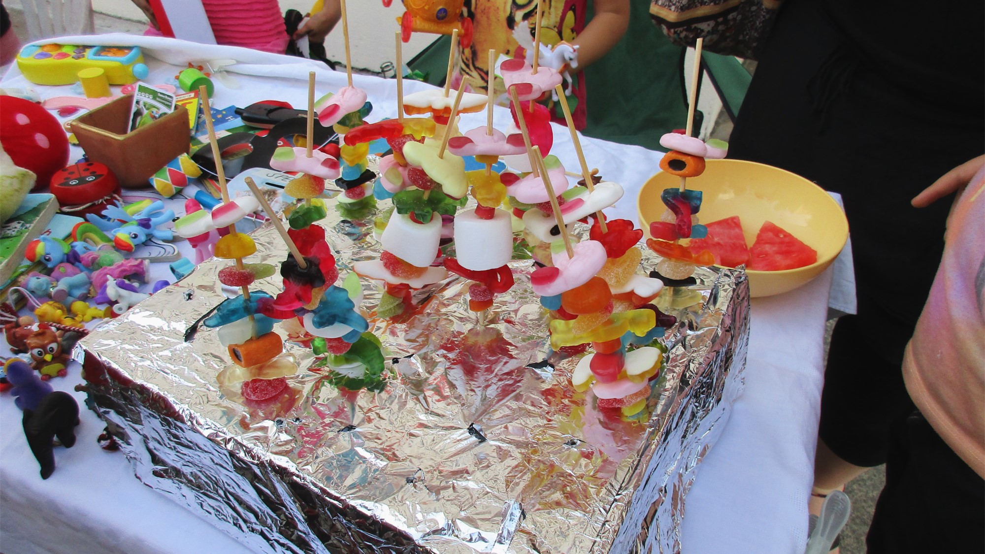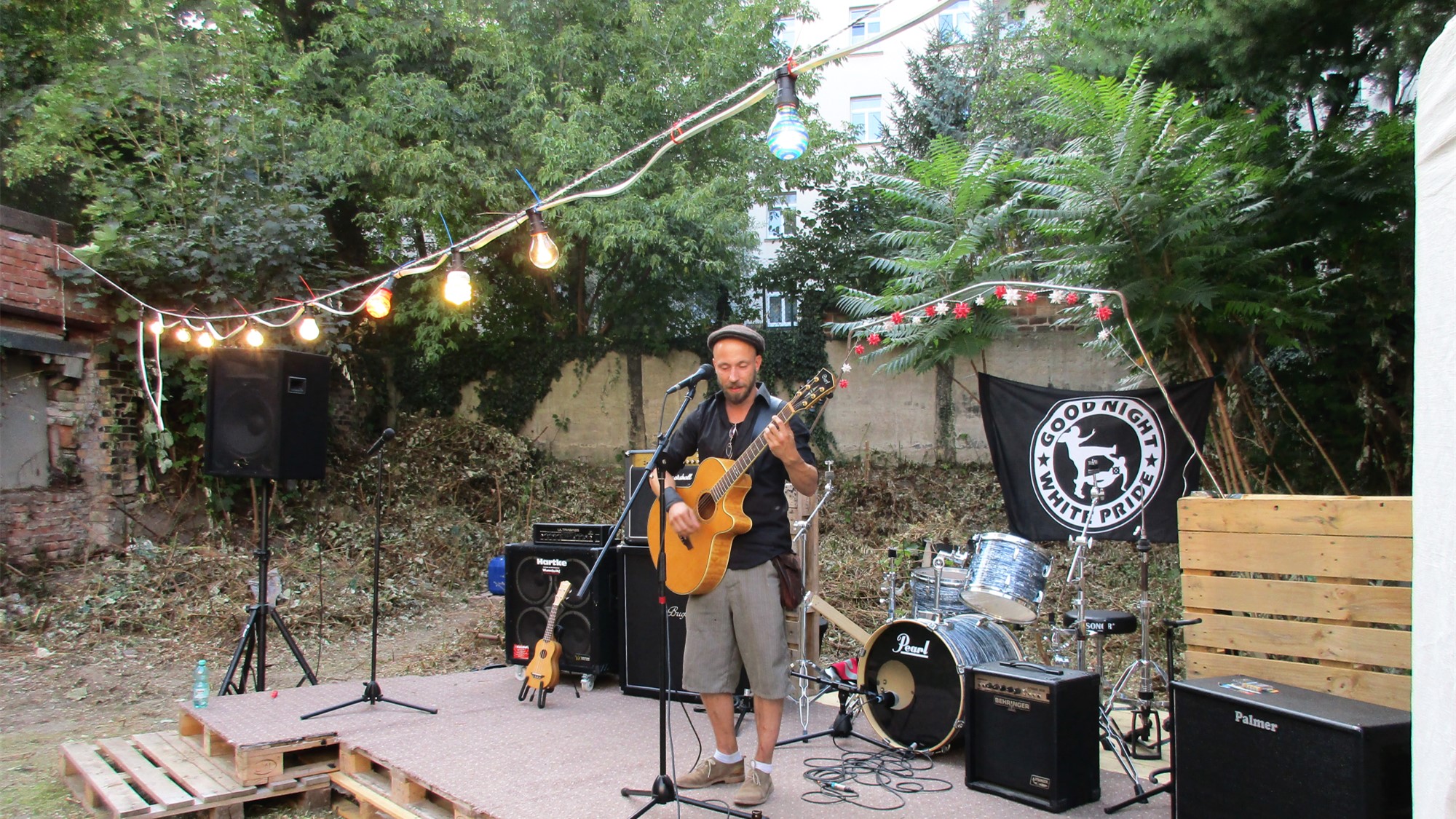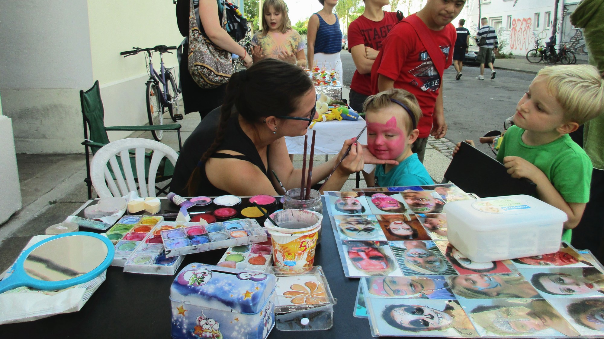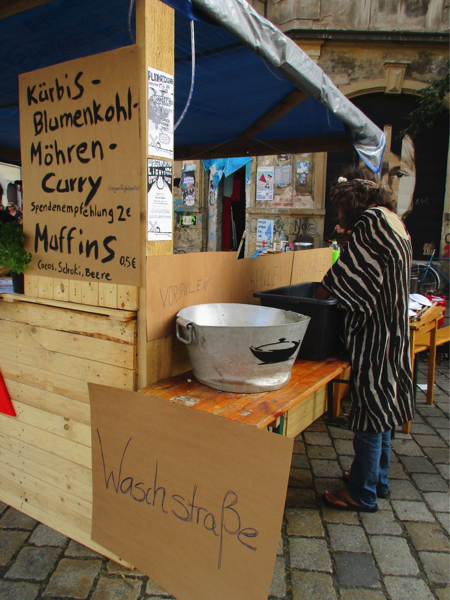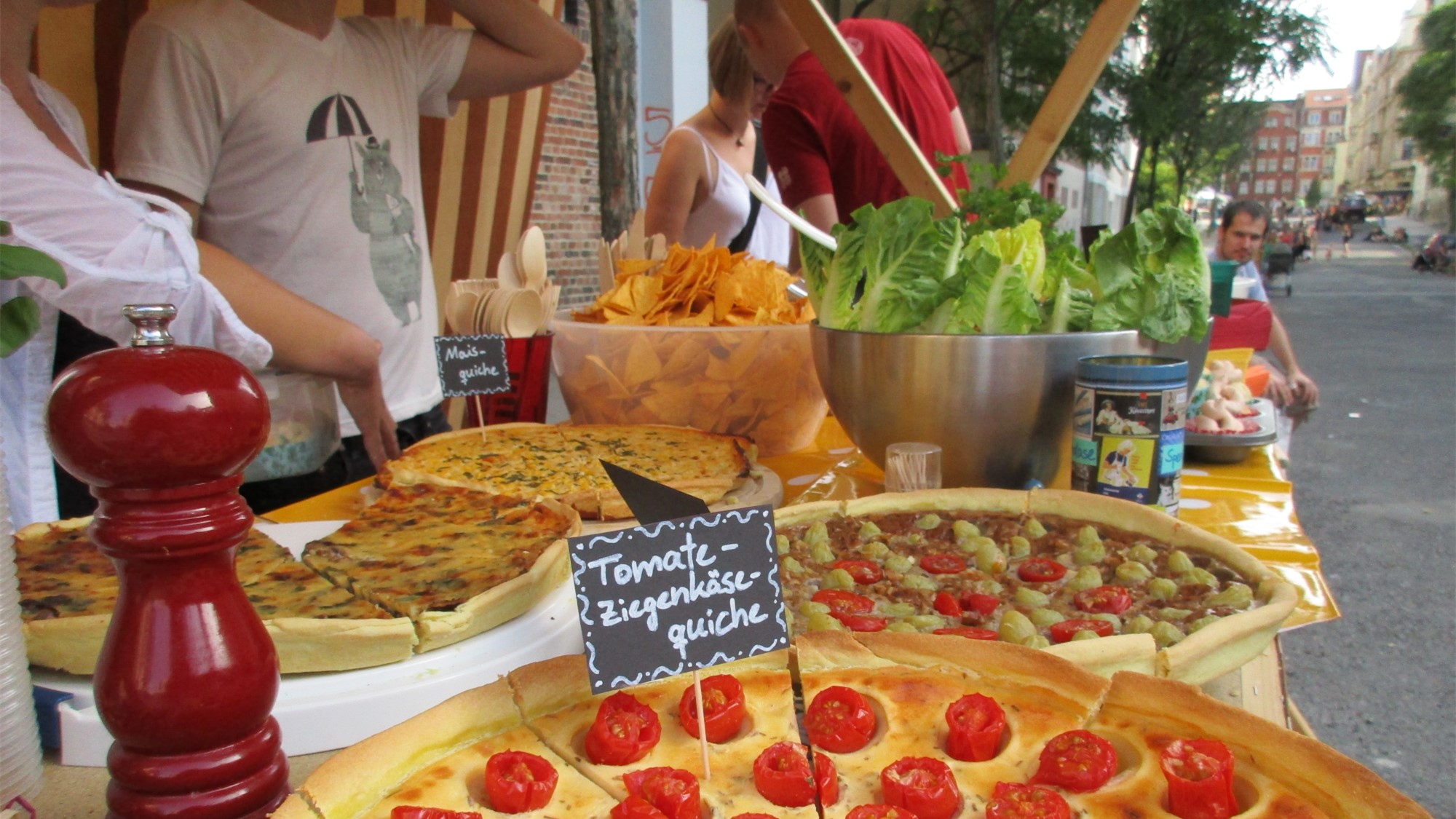 Anstatt wildem Gedränge herrscht gemütliches Gewusel. An mancher Ecke vermengt sich Raggae mit Rock und Techno, an anderer Stelle geben die kleinsten Anwohner ihre musikalischen Künste zum besten. Als ich Kohldampf bekomme, schaue ich, was es an Fressalien gibt. Ich entdecke den Stand zweier Rudolfs und probiere mich durch deren französische Quiche, arabischen Bulgur-Salat und türkischen Aufstriche mit Fladenbrot (alles selbstgemacht!). Ein paar Meter weiter genieße ich zum Dessert eine Zimtschnecke, die um einiges besser schmeckt als die Ikea-Schnecke. Als Dank geb‘ ich der Bäckerin einen kleinen Obolus. Auch in diesem Jahr galt bei Rudolf Rocks das Prinzip der freiwilligen Spende.