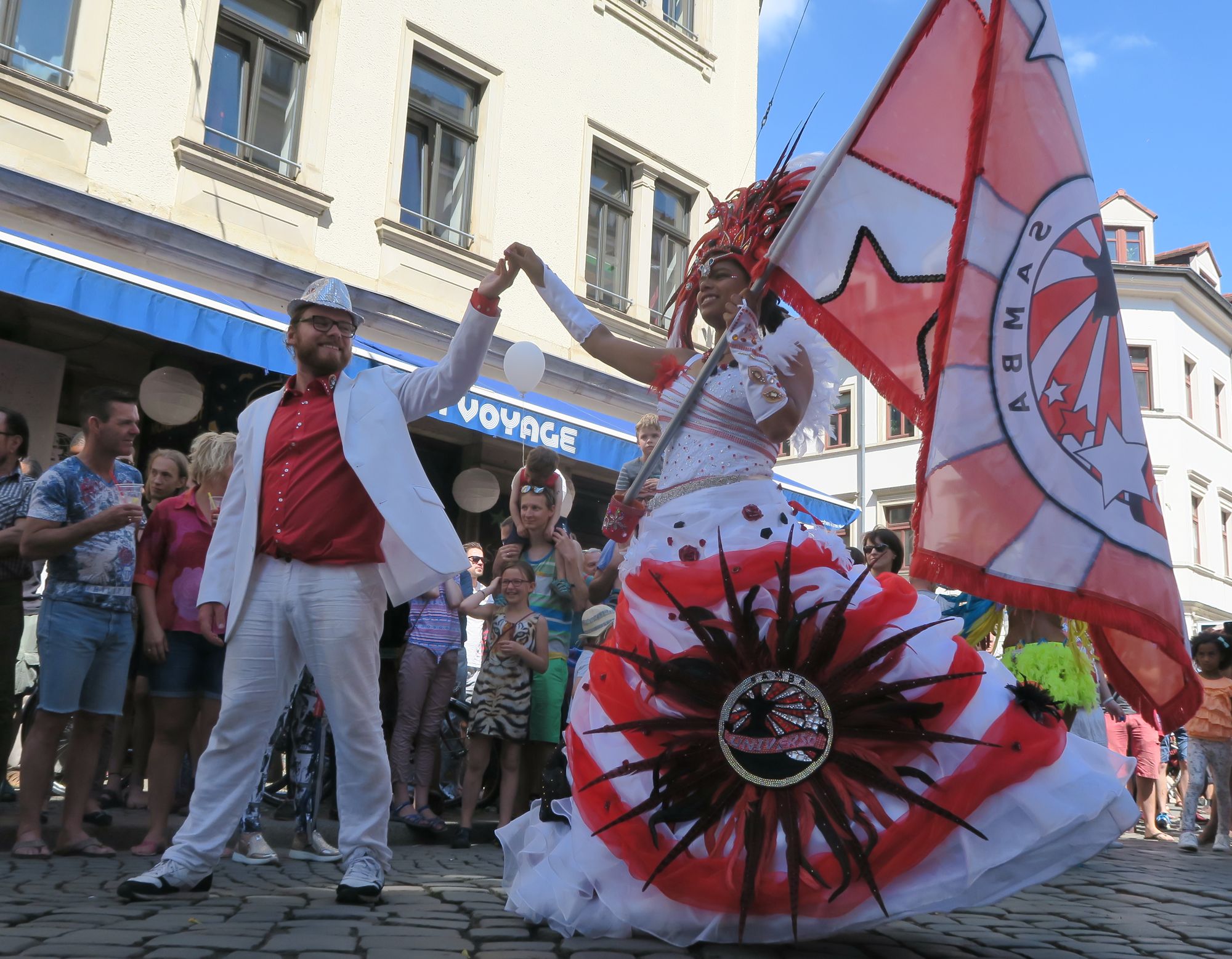 Dennoch war es insgesamt ein schönes Fest. Fast zu jeder Stunde kam man an Engstellen prima durch. Engagierte Anwohner konnte man mit witzigen Aktionen bestaunen, so man sie denn fand. Am Sonntag tafelte die halbe Neustadt wieder zum großen Gemeinschaftsfrühstück auf der Straße. Neben den vielen Rummel-Techno-Türmen gab es auch eine Menge interessanter Musik zu bestaunen. Tolle Shows gab es im Kukulida-Zelt, den Luther-Platz-Bühnen, zum Sonntags-Tanz vorm Laika und natürlich bei den Punkrockern auf dem Alaunplatz. Aufsehen erregte der brachiale Umzug der Samba-Universo-Trommler. Herrliche Publikumsaktion: Die Schokokuss-Maschine auf der Kamenzer Straße.