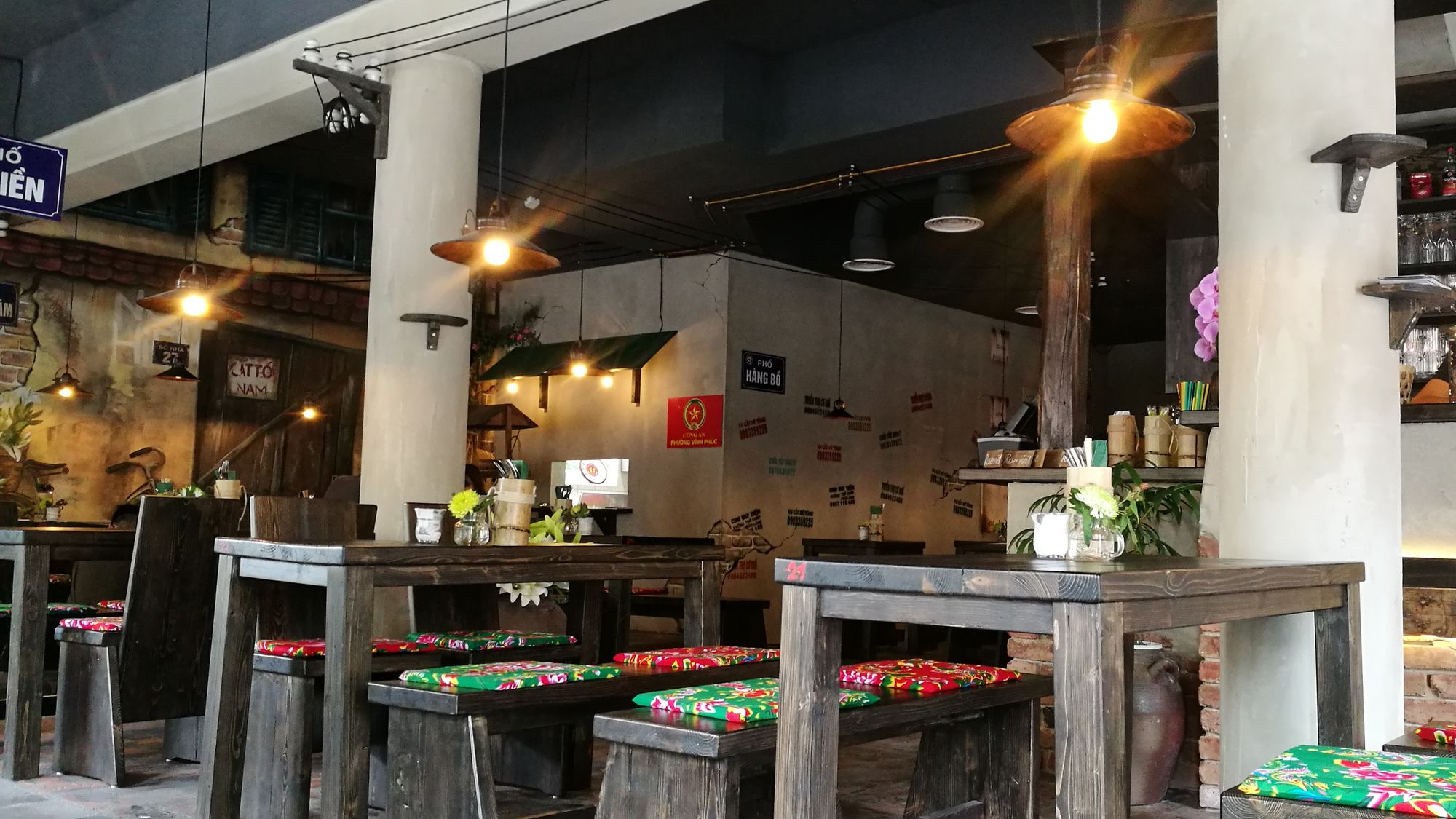 Die Einrichtung drinnen soll an das Vietnam der 70er und 80er Jahre des vorigen Jahrhunderts erinnern. Man sitzt wie in einem Straßencafé. Die Speisekarte kommt in der Aufmachung einer Boulevard-Zeitung daher. Sehr retro, aber leider ein bisschen unübersichtlich.