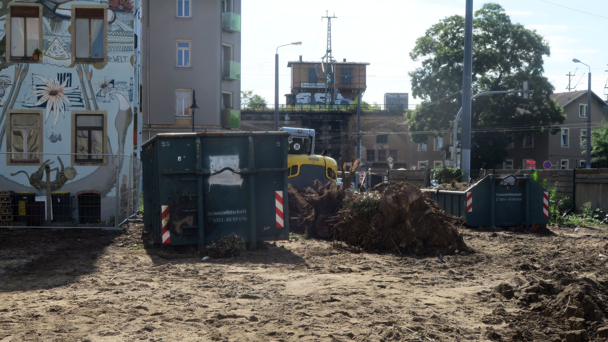 Auf der Baustelle finden derzeit Bauvorbereitungsarbeiten statt. Hier soll demnächst ein Wohn- und Geschäftshaus entstehen (Siehe Neustadt-Geflüster vom 6. August). In unmittelbarer Nähe auf der anderen Seite des Platzes hatten Unbekannte im Juni ein Auto angezündet (Neustadt-Geflüster vom 11. Juni 2017).