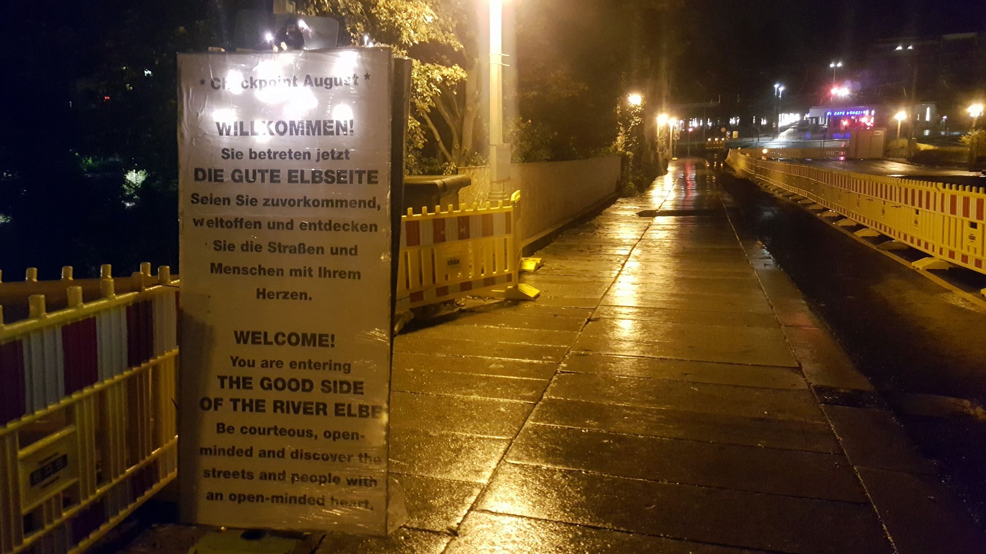 Die Rückseite liest sich so: „Attention! You are entering the once peaceful side of the river Elbe…and particularly on Friday and Saturday nights watch the salvation of your soul, your wallet, your phone, your skirt and please no longer answer any questions by strangers about what time it is, otherwise your watch may be gone too.“