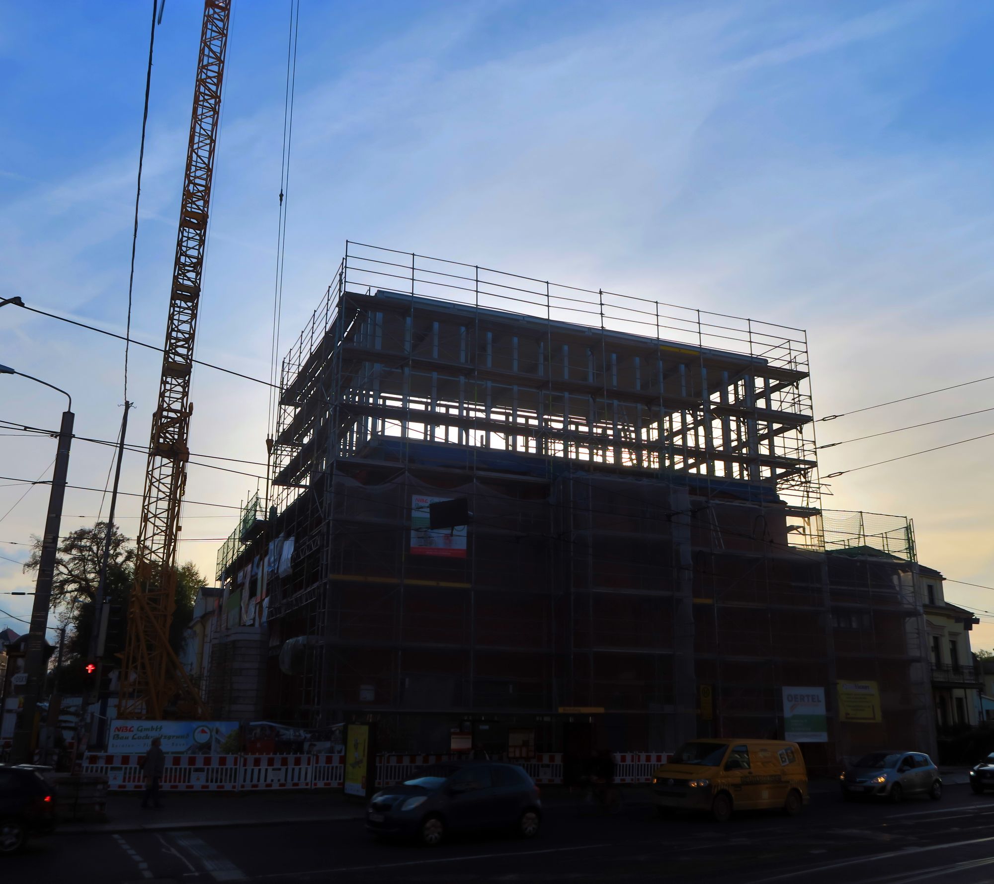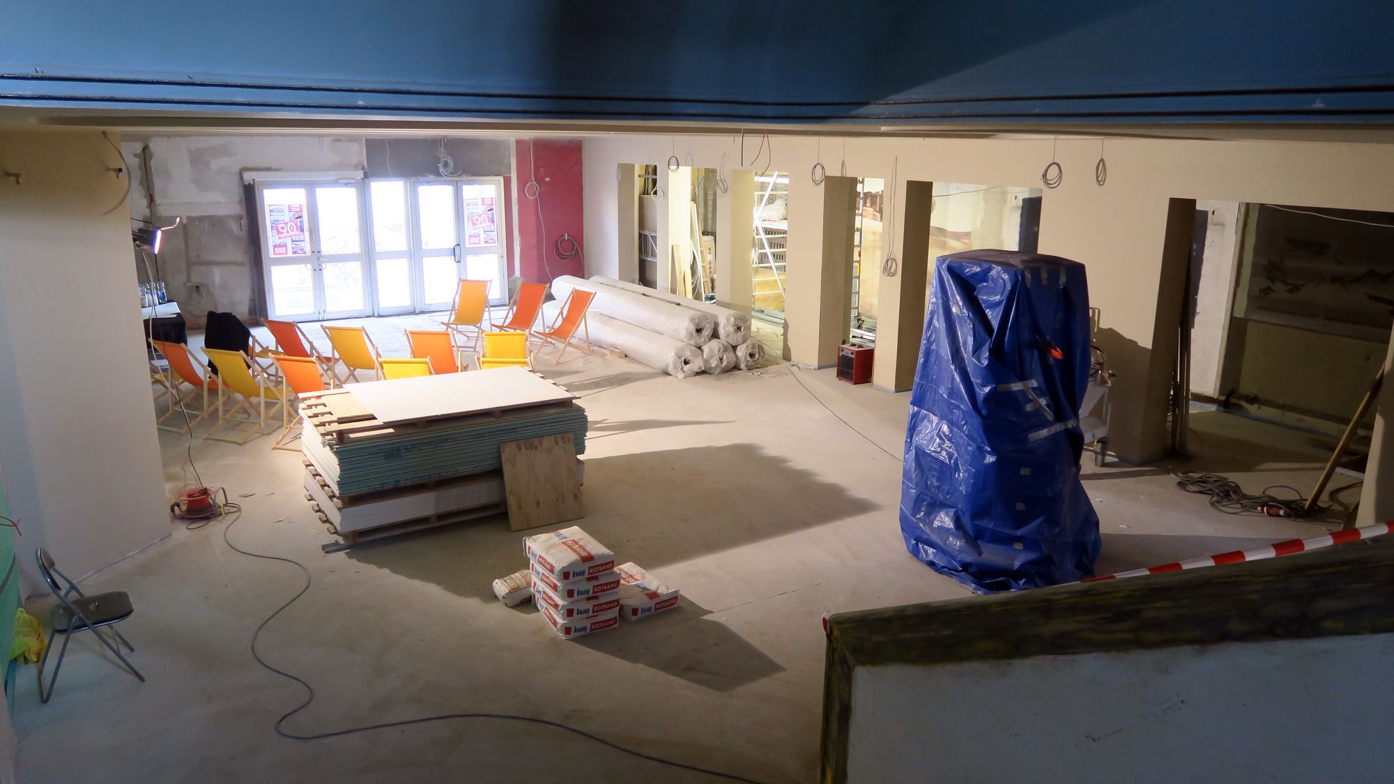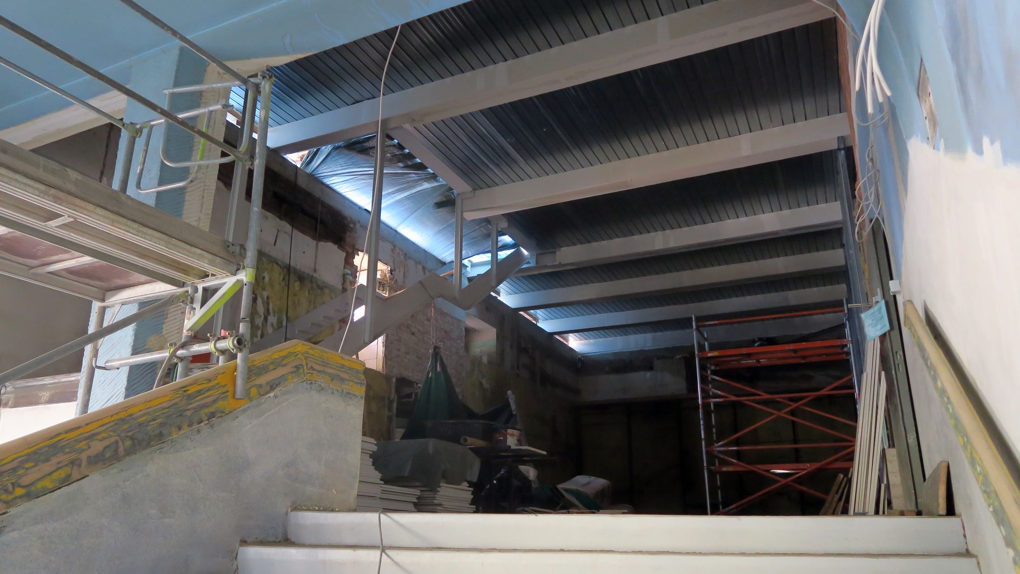 Der Fußboden für den neuen Saal auf dem Dach liegt schon, die Treppe kann man auch schon erahnen.