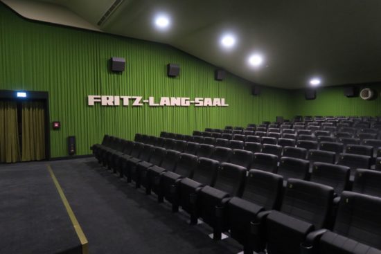 Der große Sergio-Leone-Saal ist schon fast fertig. Die alte Wandbemalung ist gewichen, der Stuck geblieben, die Stühle sind neu. Bild und Ton wurden verbessert.Fritz-Lang-Saal mit Ledersitzen. Gemütlich.Ebenfalls fertig ist der Fritz-Lang-Saal im Erdgeschoss. Mit dem grünen Velour-Stoff und den schwarzen Ledersesseln wirkt er richtig edel. Die Sitze sind nummeriert. Ob diese Nummern auch für den Kinobetrieb genutzt werden, steht noch nicht fest. Neben dem Eingang zum Fritz-Lang-Saal wird es künftig in den Keller gehen. Der Name für das fünfte Kino steht schon fest: Charles-Chaplin-Saal.