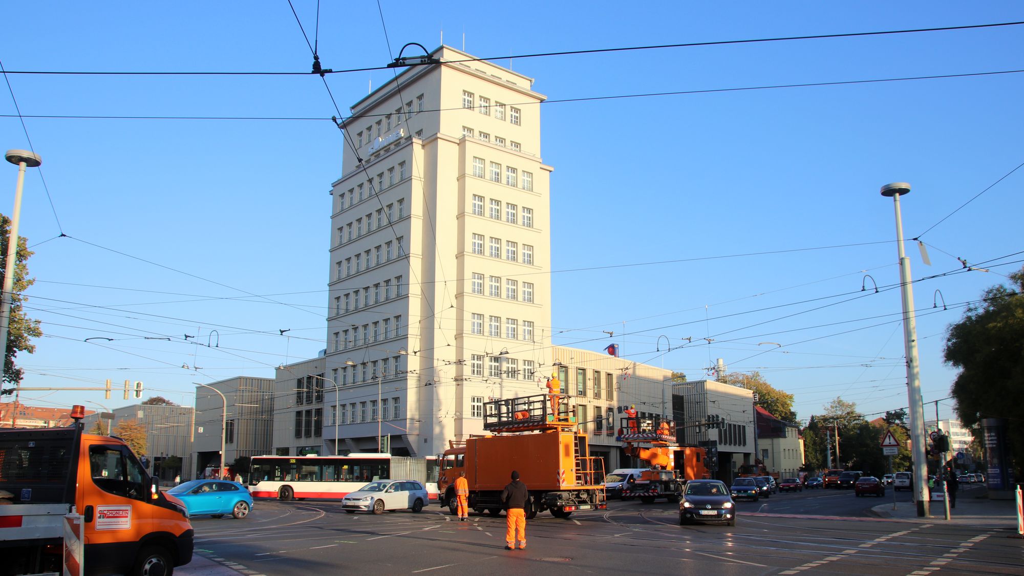 Seit den frühen Morgenstunden reparieren die Dresdner Verkehrsbetriebe (DVB) das Gleiskreuz am Albertplatz. Dafür sind umfangreiche Änderungen in der Verkehrsführung